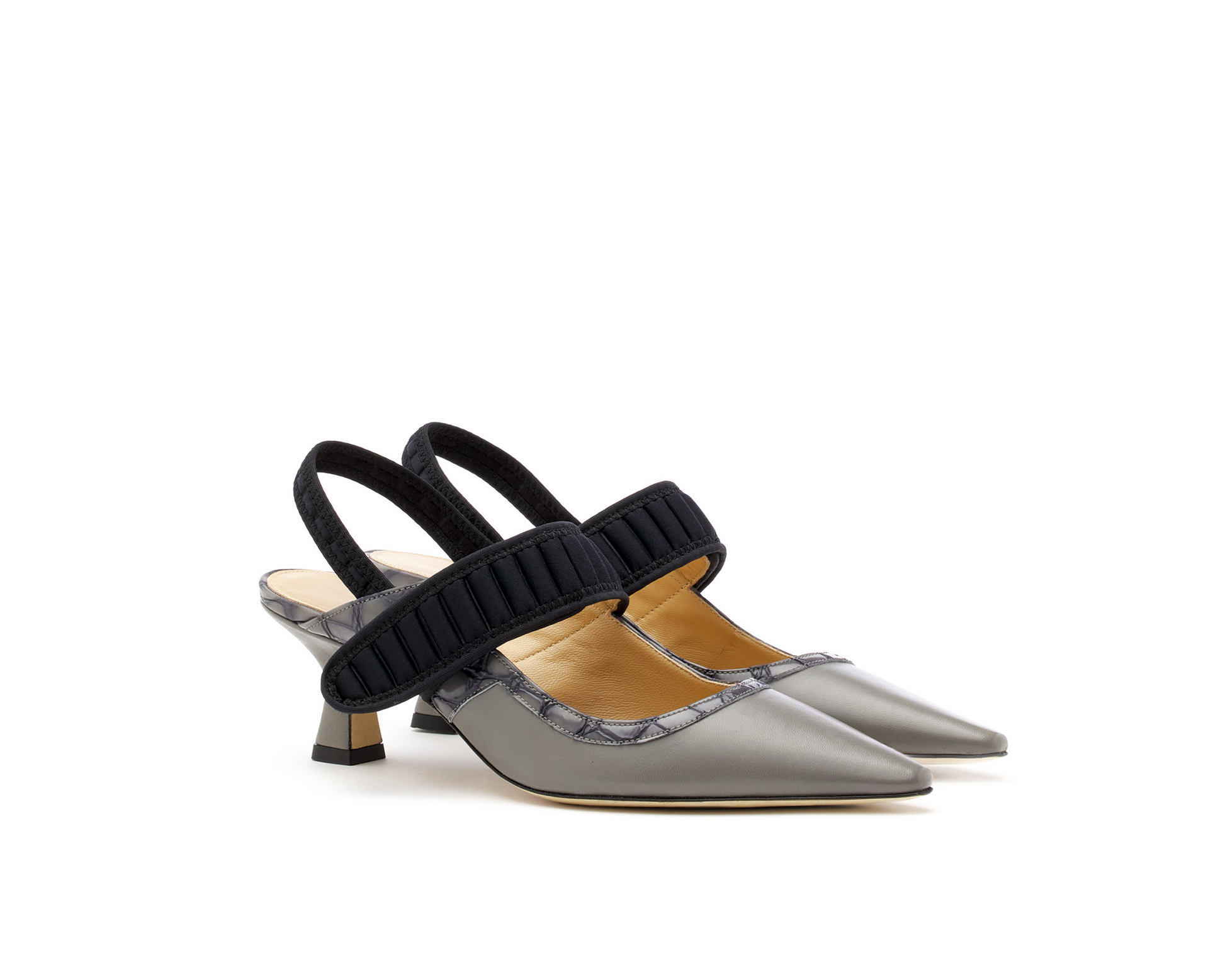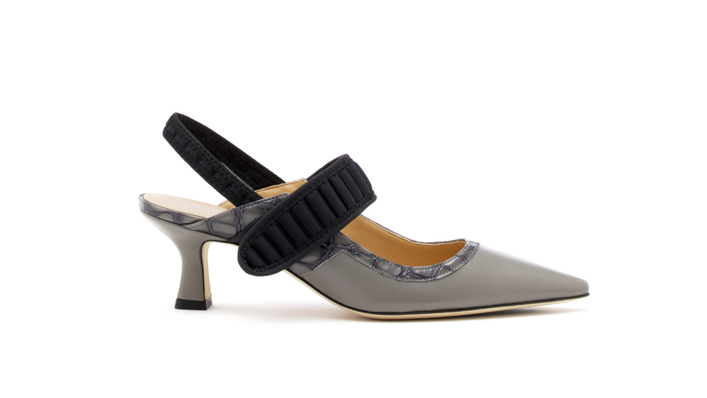 Elephant nappa slingback with pointed toe, adjustable padded black neoprene velcro closure, and thin strap on the heel. Grey crocodile print trim details complete the design. 65 mm wedge heel, designed for prolonged comfort, perfect to accompany you from morning to evening.