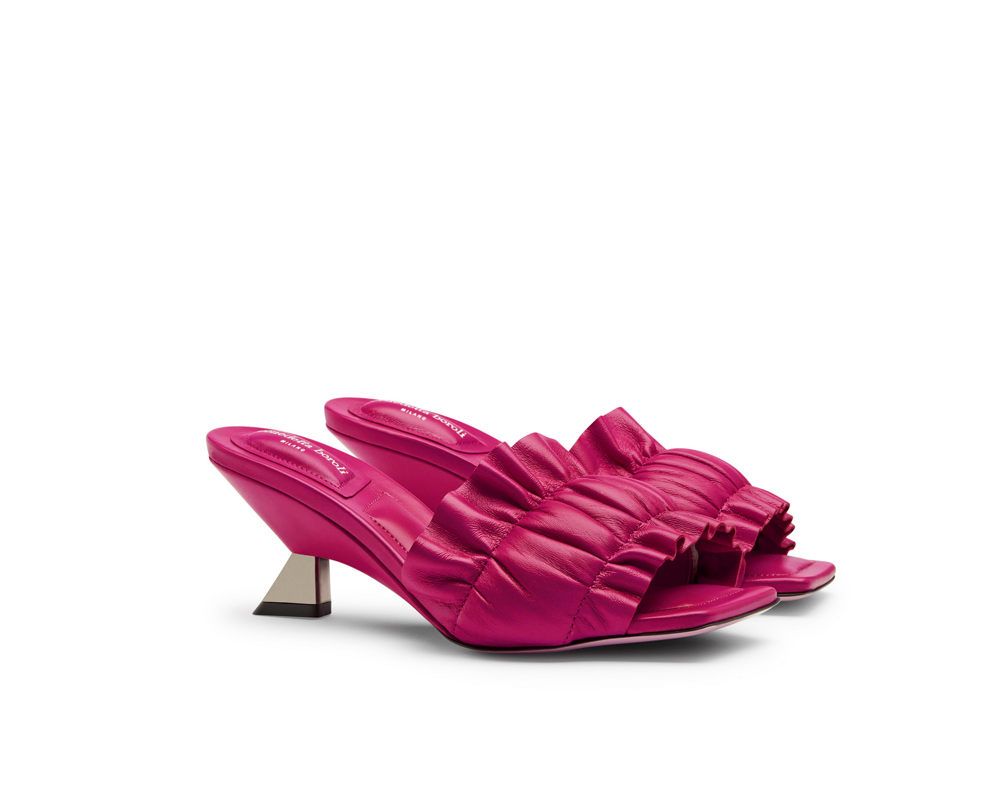 Magenta nappa sandal with ruffle detail and puffy strap. The elegant and feminine silhouette pairs with the iconic 65 mm high wedge heel, while the padded insole ensures prolonged comfort. The ruffle adds movement and the puffy strap a modern and lively touch, reinterpreting a classic model with a contemporary design.