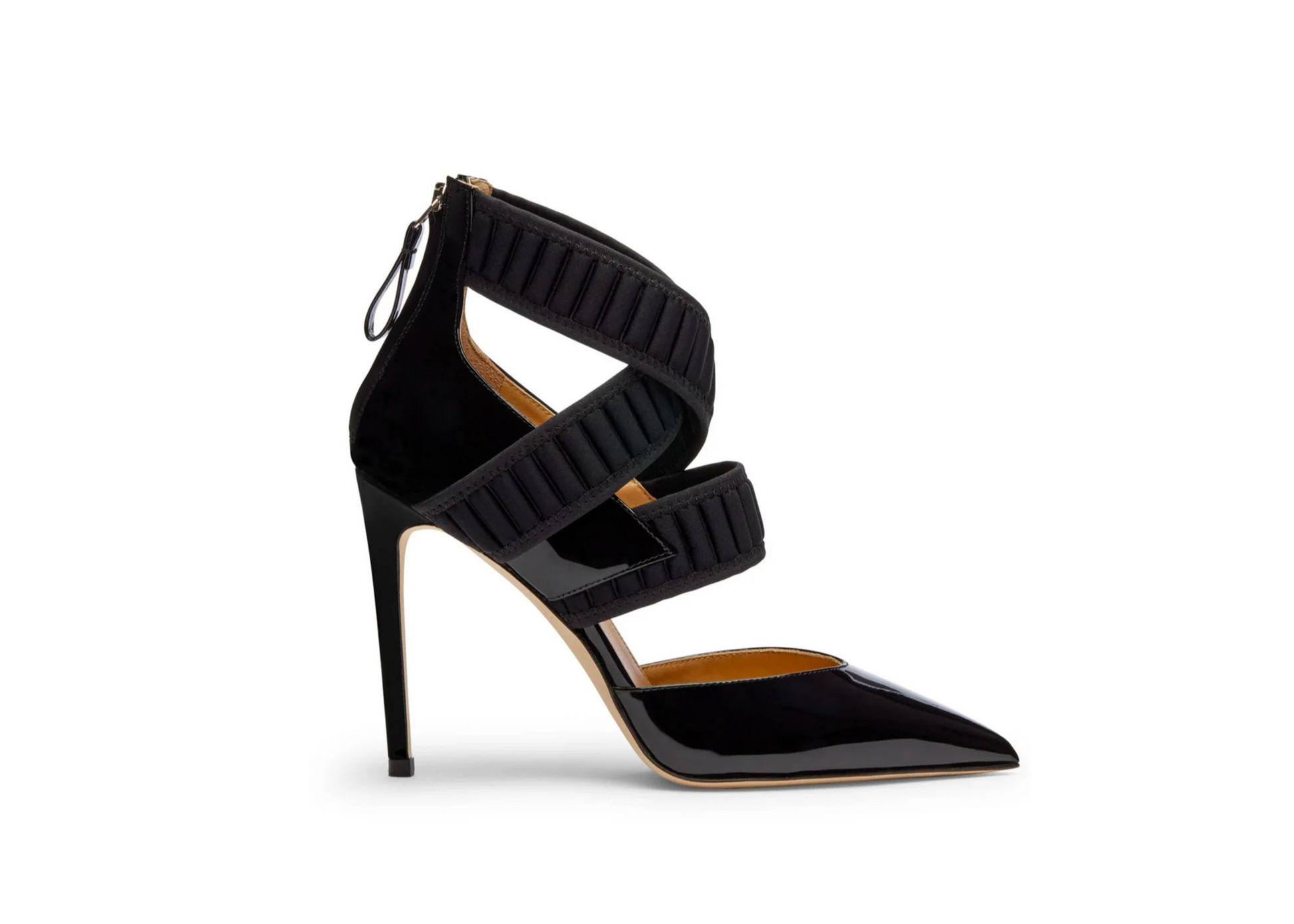 Black patent leather pumps with a pointed toe and curved neckline. The design is enhanced by three black padded neoprene straps, two of which are crossed, elegantly wrapping around the instep and ankle, providing stability and support. Rear zipper for a practical and discreet closure. The 100mm stiletto heel elongates the silhouette and defines a shoe with a bold character.