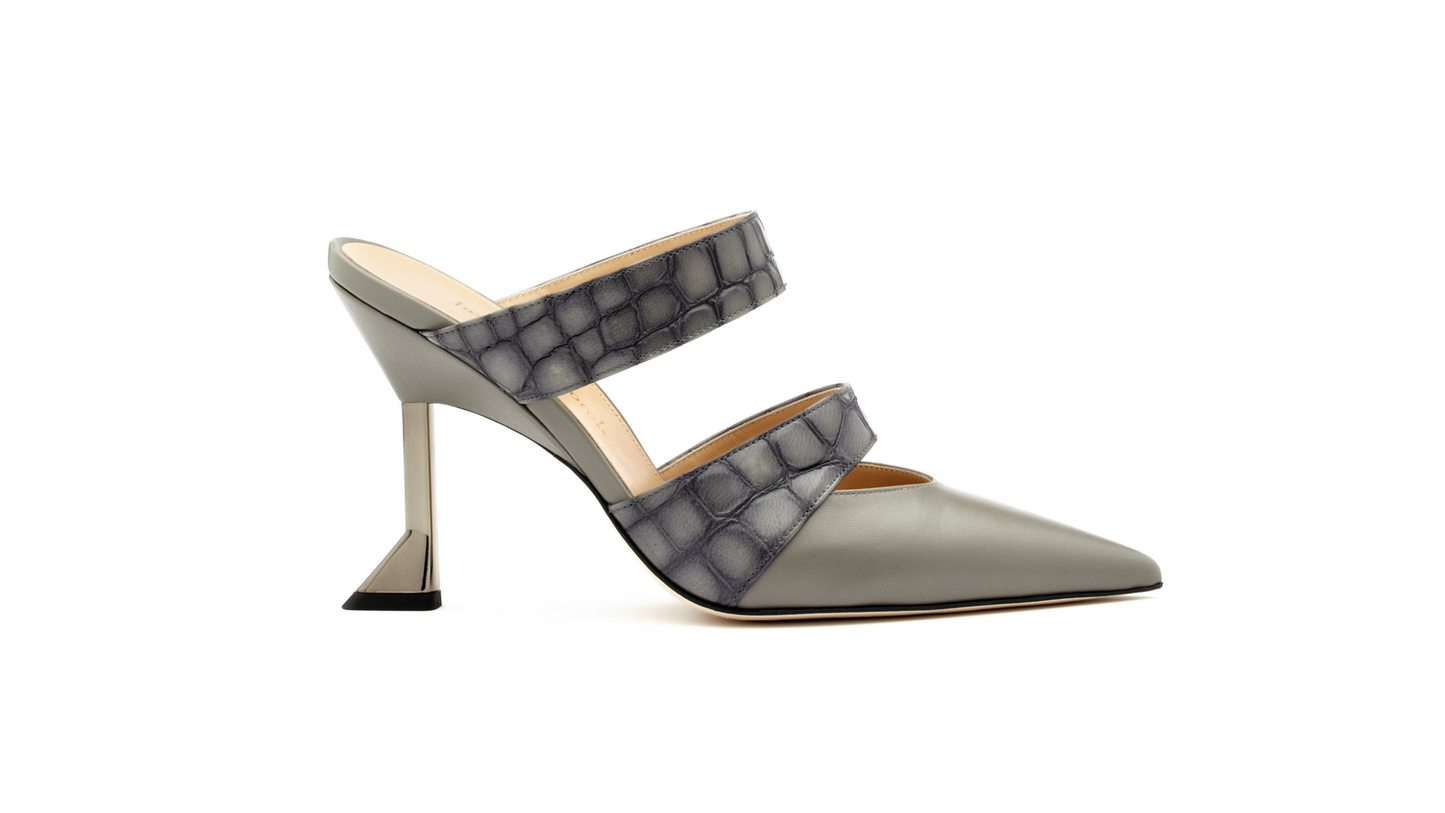 The Mya Grey women's clog adds a subtle touch of refined extravagance to your outfit. Handmade, entirely Made in Italy, this shoe stands out thanks to the sensual straps that wrap around the instep. Always present is the iconic 90mm wedge heel: the mini wedge offers daily comfort and practicality, while the customized heel gives the shoe a modern twist and a fresh contemporary look. Since this part is not covered in leather, it won’t wear out over time!