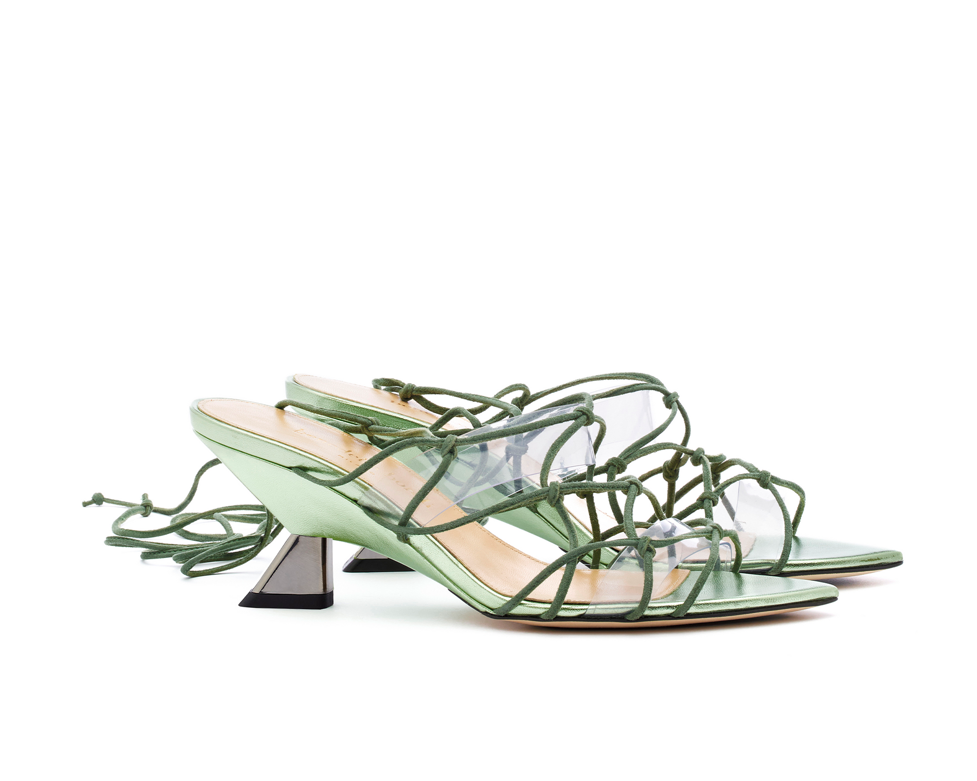 The green Olga women's sandal is perfect for social events and dancing nights. Its unmistakable design is made charming by the thin suede laces that, forming a play of knots, give the shoe the style of ancient Greece. The PVC straps allow the sandal to be worn practically, without having to tie and adjust the laces with every wear. Additionally, they help the foot maintain its silhouette thanks to their supportive function. Our iconic 65mm wedge heel is always present, made up of two parts: the wedge that provides comfort and daily practicality, while the small heel gives the shoe a modern twist and a new contemporary look. Since this last part is not covered in leather, it does not wear out over time!