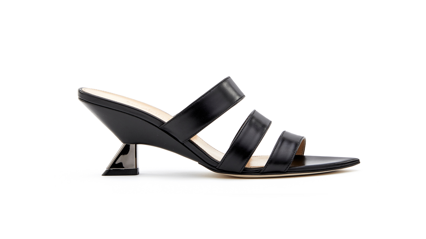Elegant sandal in black nappa, featuring a refined design and a three-strap construction, crafted in soft nappa to precisely wrap the instep while providing support and comfort. The tapered silhouette is accentuated by a slightly elongated toe, designed to lengthen the figure and flatter the line of the foot. Completed by a 65 mm wedge heel that is stable and well balanced, it ensures a smooth, lightweight walk—ideal for effortless elegance at any time of day.