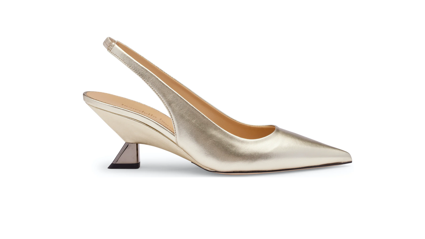 Platinum laminated nappa slingback with a pointed toe, featuring a minimalist design that highlights its elegance. The rear elastic ensures a stable and comfortable fit, while the iconic 65 mm wedge heel provides the right support and prolonged comfort. A model designed to be worn from morning to evening without sacrificing elegance.
