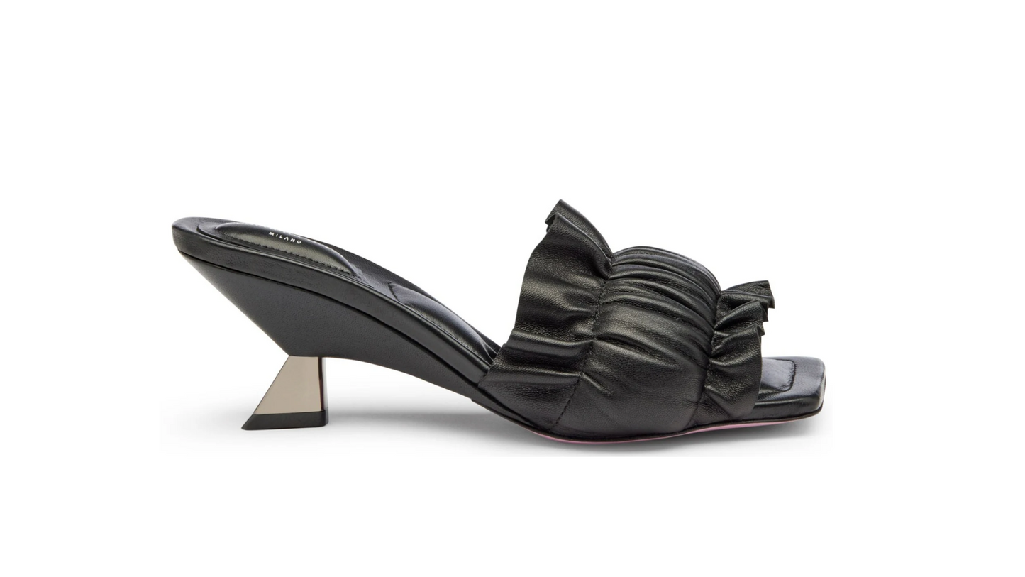 볼란트 디테일과 퍼피 밴드가 있는 블랙 나파 가죽 샌들입니다. 우아하고 여성스러운 실루엣은 상징적인 65mm 높이의 웨지 힐과 잘 어울리며, 쿠션 처리된 인솔은 장시간 착용해도 편안함을 보장합니다. 볼란트는 움직임을 더해주고 퍼피 밴드는 현대적이고 생기 있는 터치를 더해 클래식한 모델을 현대적인 디자인으로 재해석했습니다.