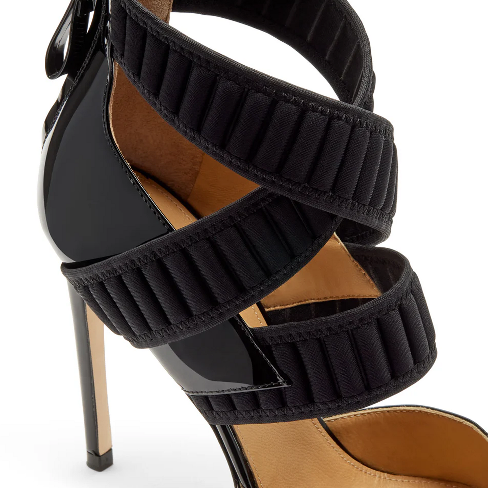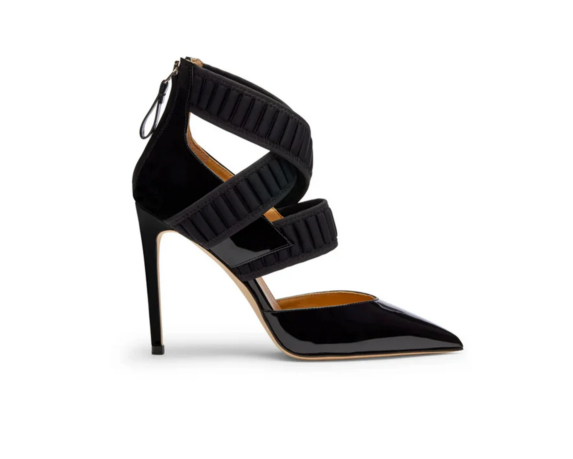 뾰족한 앞코와 곡선형 네크라인이 돋보이는 블랙 페이턴트 데콜테 슈즈입니다. 디자인은 두 개가 교차된 세 개의 볼륨감 있는 블랙 네오프렌 스트랩으로 우아하게 발등과 발목을 감싸 안정감과 지지력을 제공합니다. 실용적이고 깔끔한 뒷지퍼 클로저가 있습니다. 100mm 스틸레토 힐이 실루엣을 길게 만들어주며 강렬한 개성을 표현합니다.