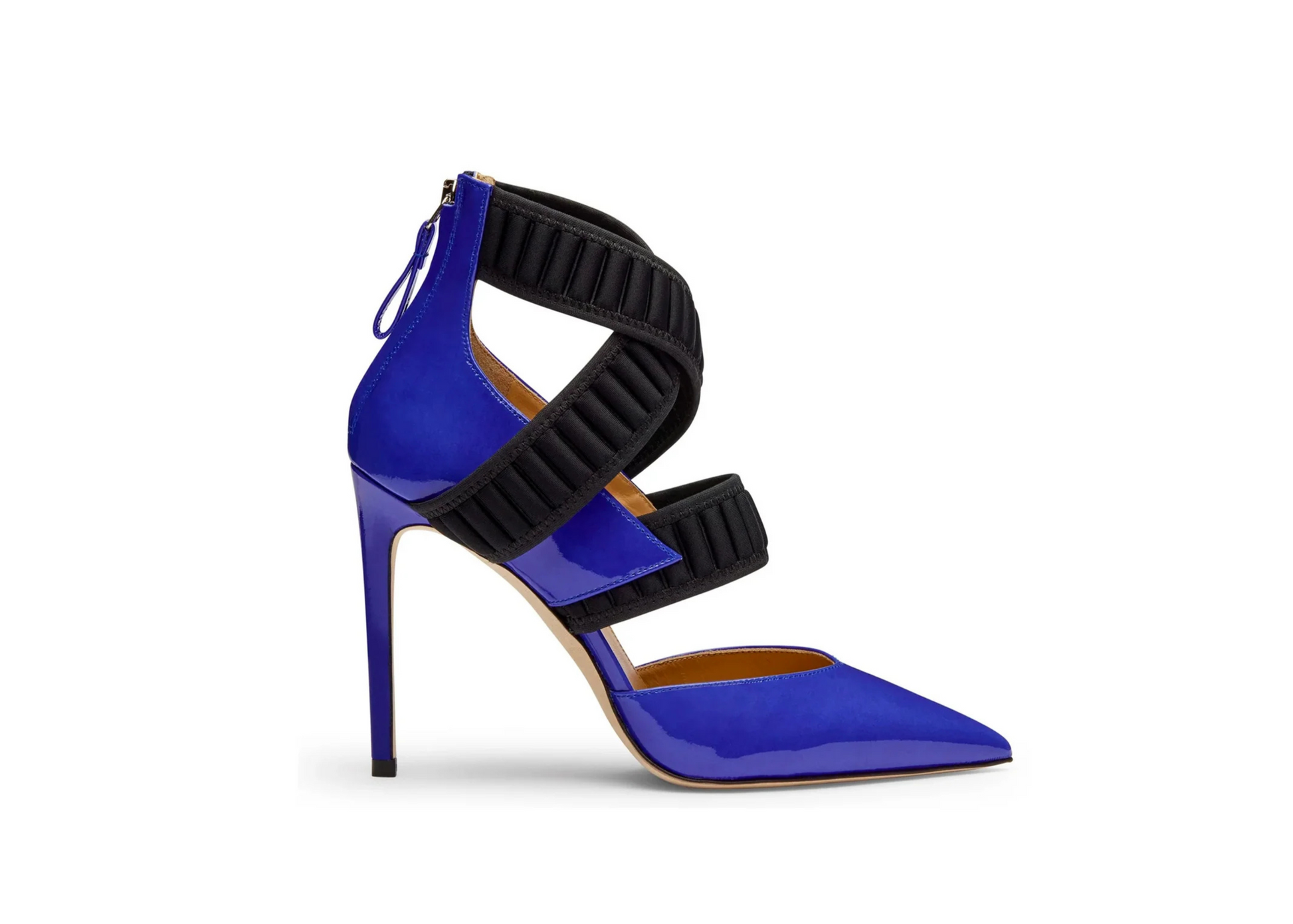 블루 임페로 에나멜 데콜테, 뾰족한 앞코와 곡선형 네크라인. 디자인은 두 개가 교차된 세 개의 검은색 네오프렌 볼륨 밴드로 고급스럽게 발등과 발목을 감싸 안정감과 지지력을 제공합니다. 실용적이고 은은한 뒷지퍼 클로저. 100mm 스틸레토 힐이 실루엣을 길게 만들고 강렬한 개성의 신발을 완성합니다.