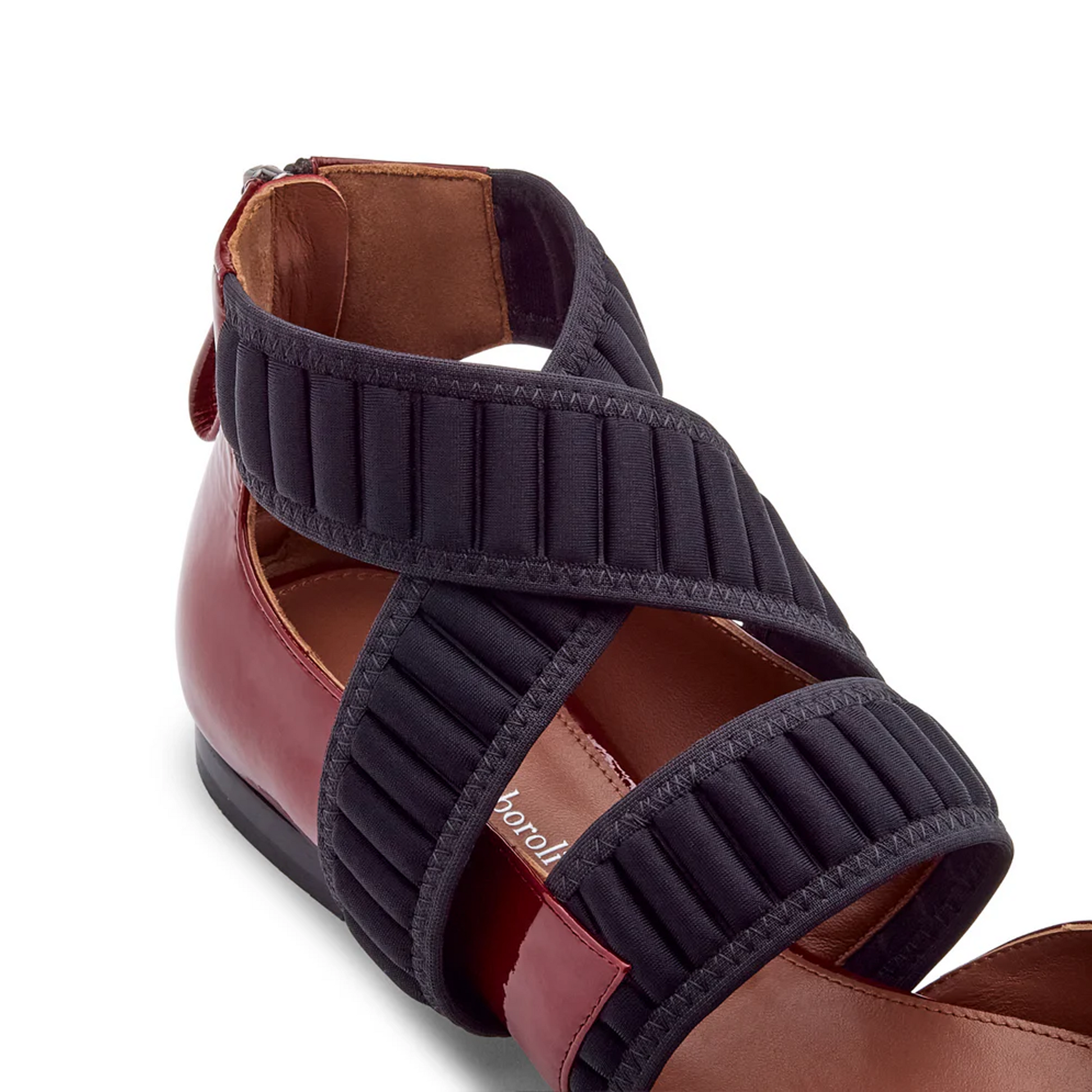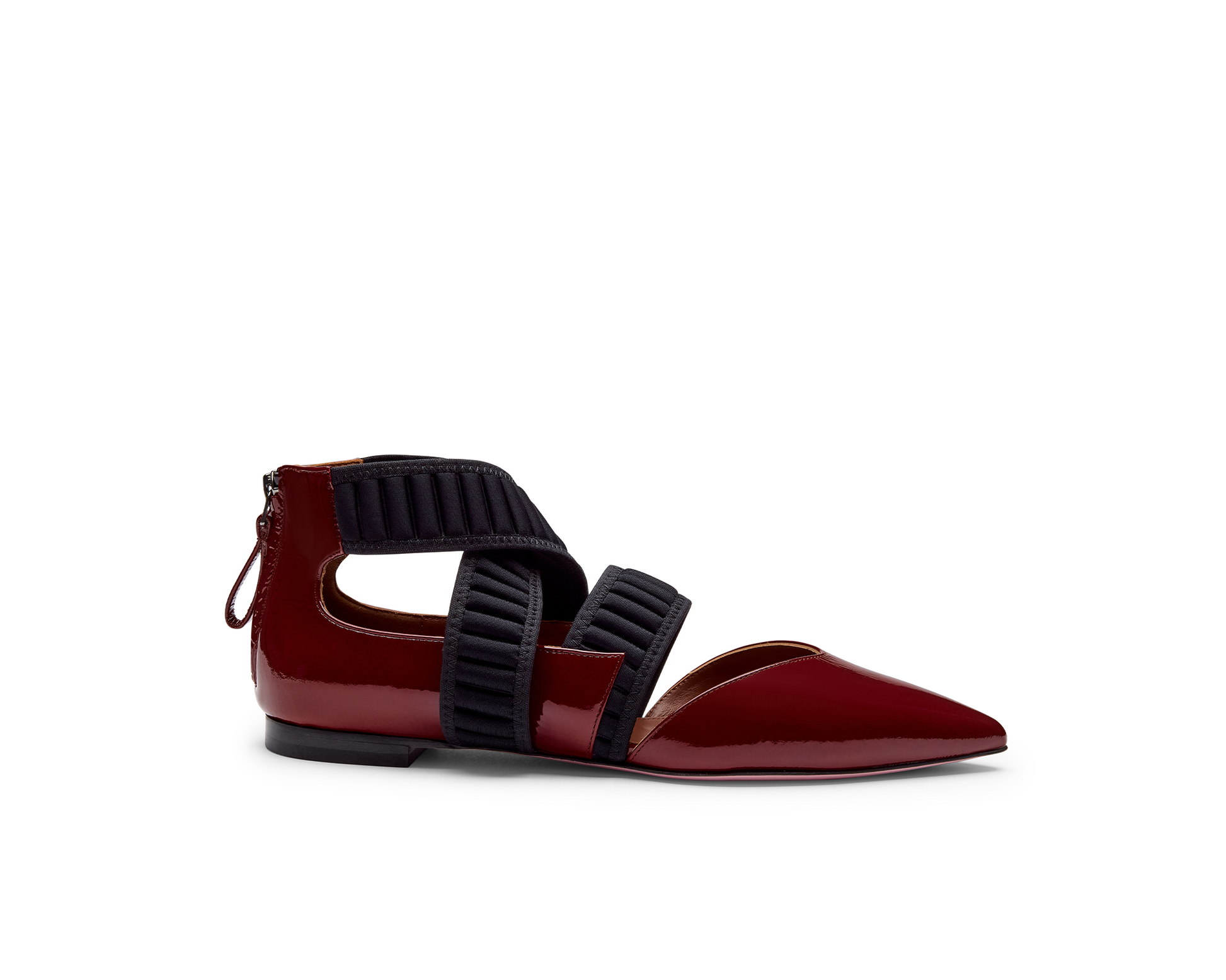 현대 복합 디자인의 감각과 생동감 있는 색조를 불러일으키는 럭셔리 발레리나. 길게 늘어진 형태의 여성스러움, 낮은 굽의 편안함.
