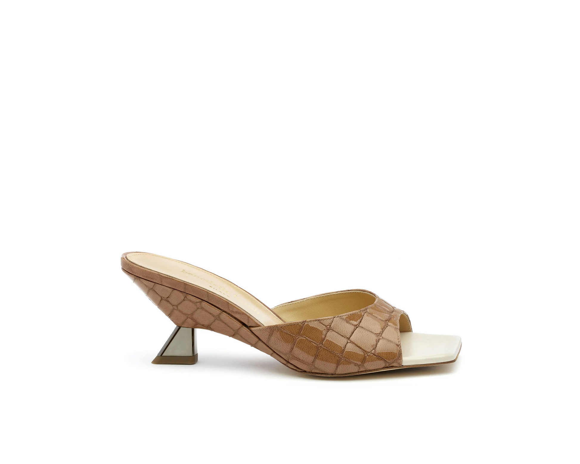 알리사 샌들은 사막 코코 프린트로 깊은 네크라인, 현대적인 사각 발끝, 그리고 65mm 높이의 아이코닉한 웨지 힐을 특징으로 합니다.