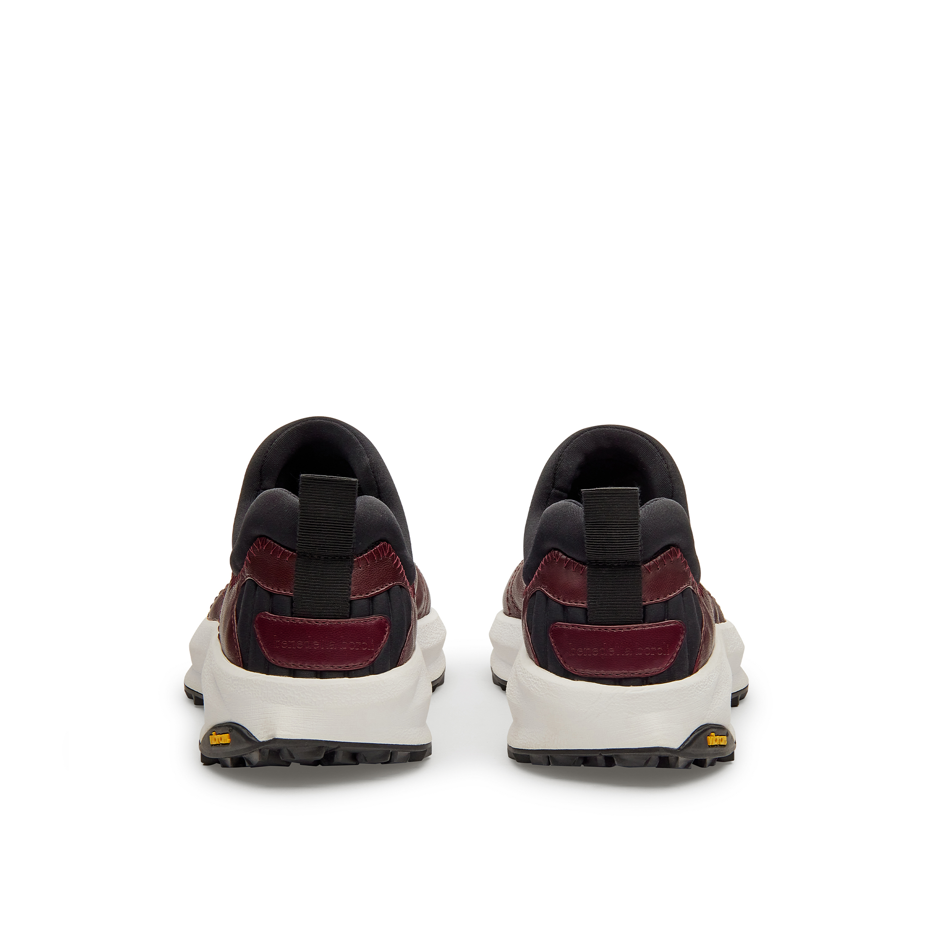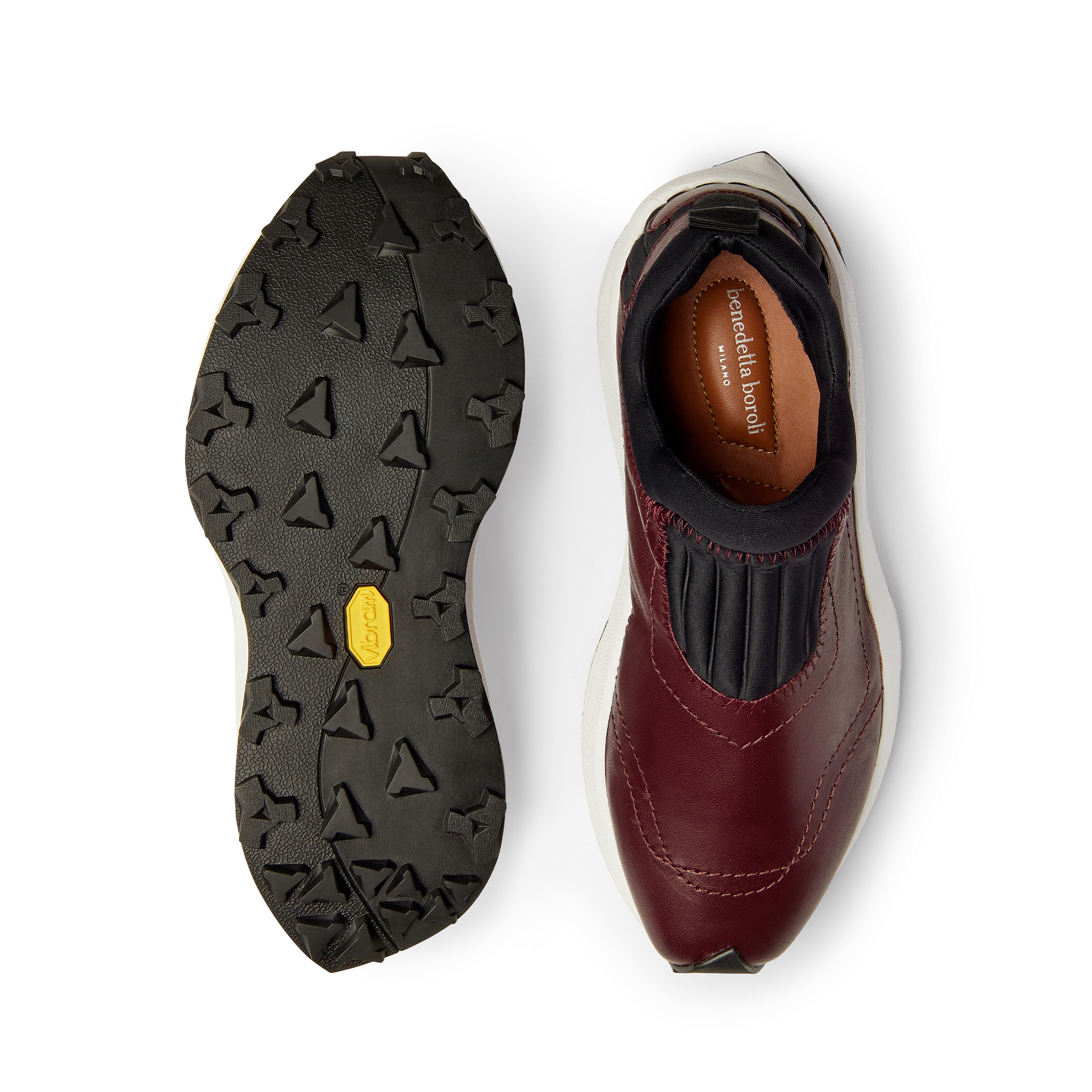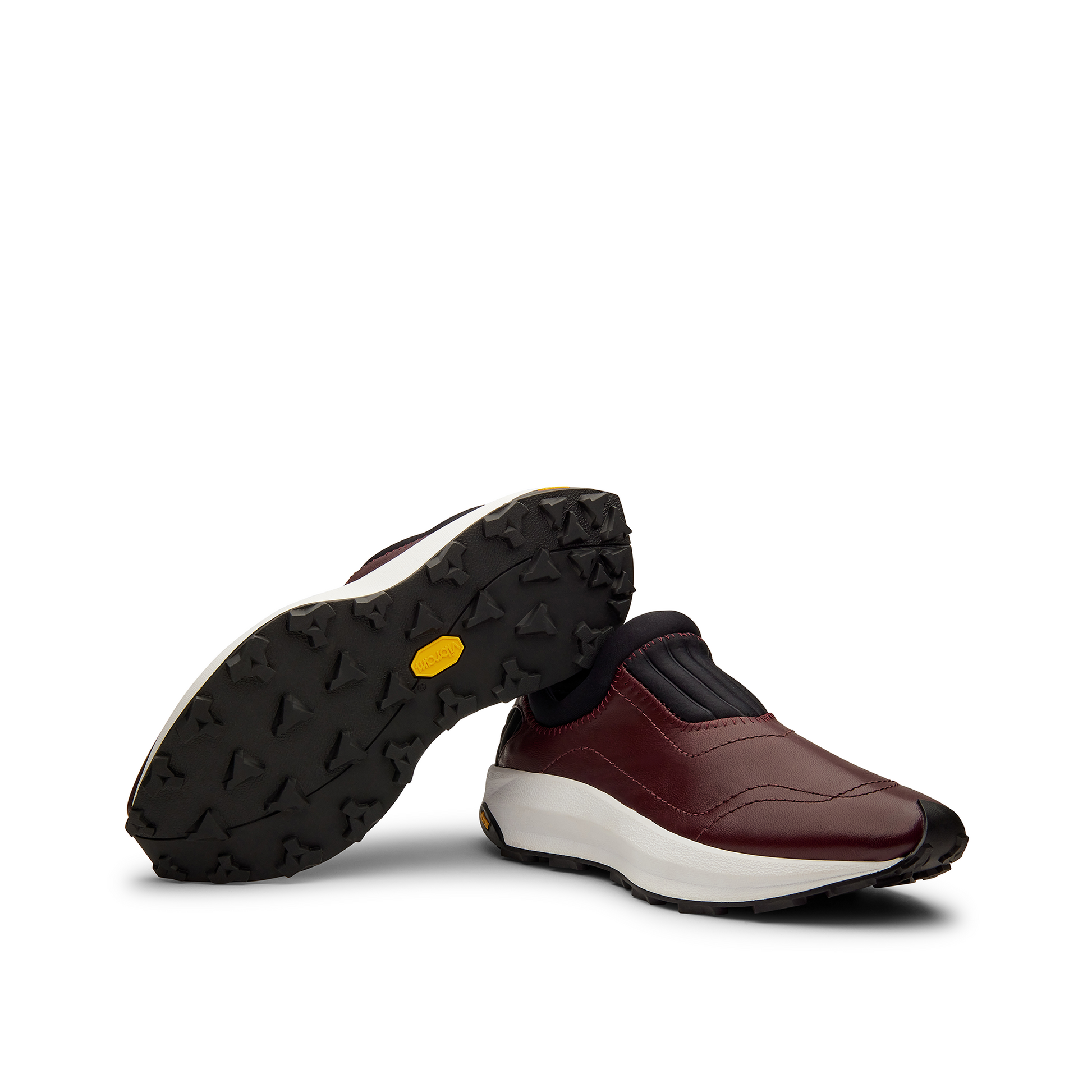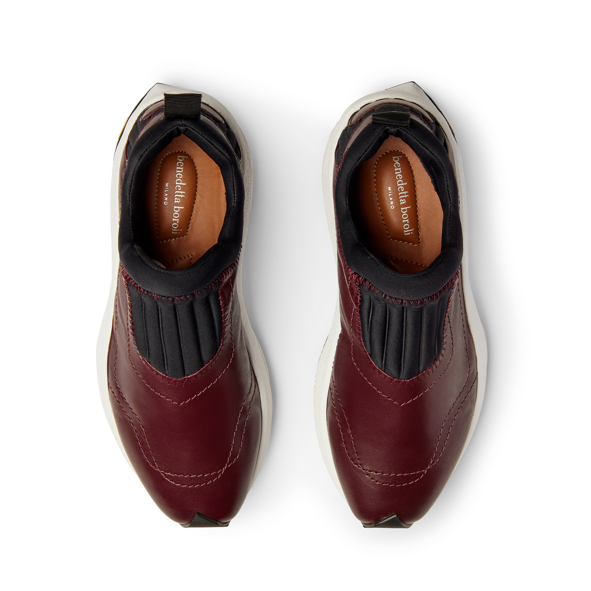 버건디 색상의 나파 가죽으로 된 킴 슬립온 스니커즈. 현대적이고 여성스러운 디자인을 위한 블랙 볼륨 네오프렌 스트랩 디테일.