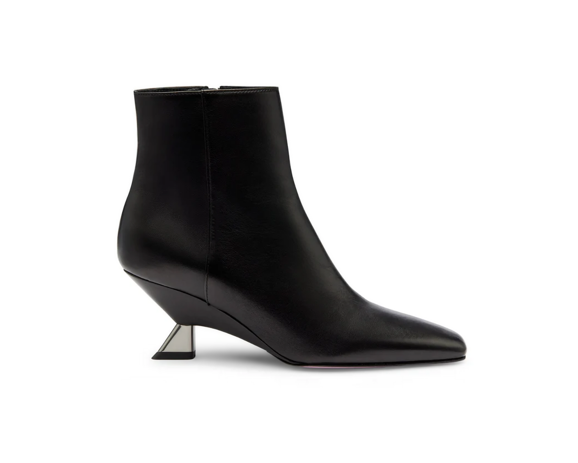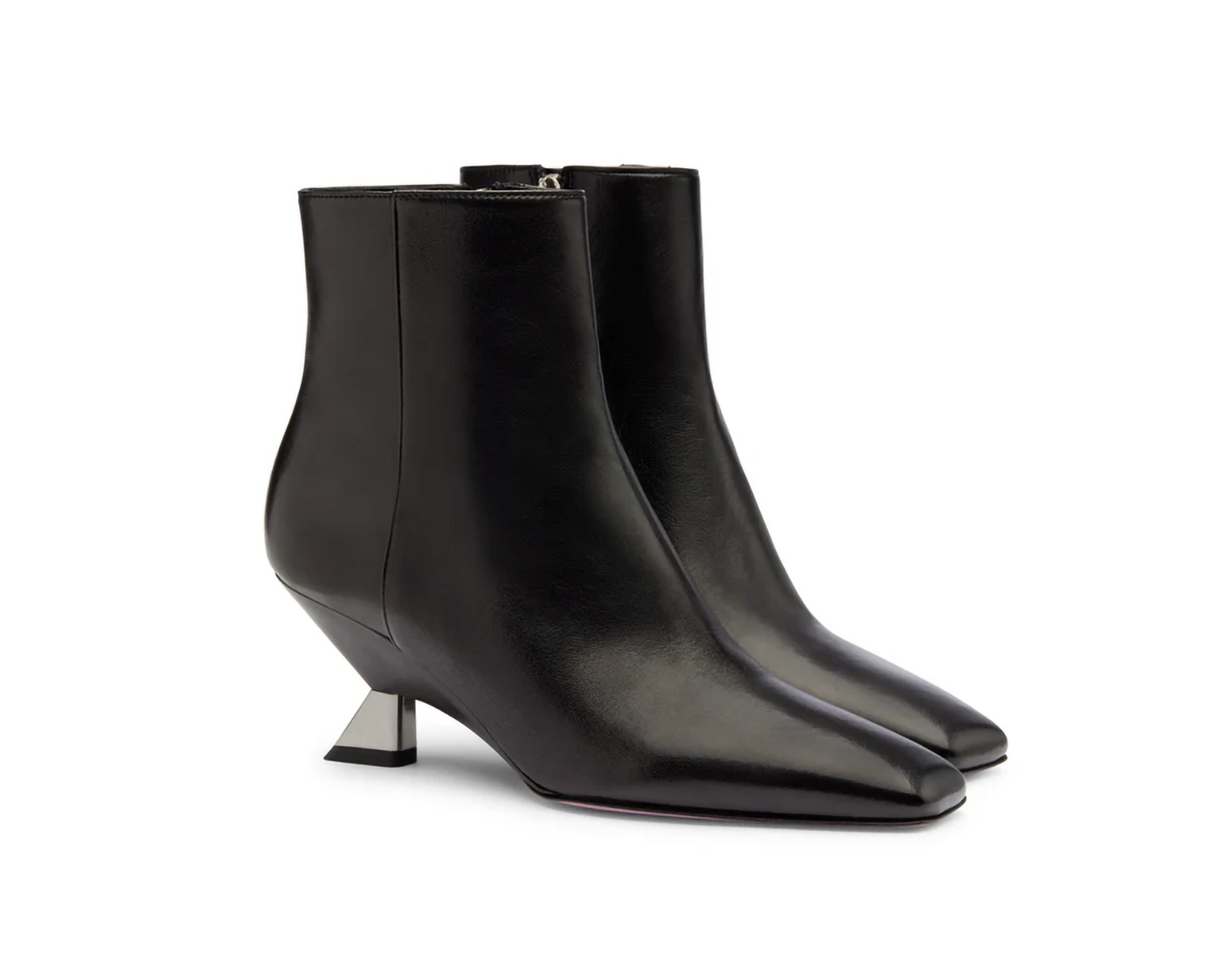 모던하고 세련된 우아함을 위해 디자인된 65mm 웨지 굽과 네모난 앞코가 특징인 블랙 나파 가죽 앵클 부츠입니다. 옆면 지퍼 클로저는 실용적이고 편안한 착용감을 보장하며, 웨지 굽은 실루엣에 균형감과 활력을 더해줍니다. 현대적인 디자인, 일상적인 편안함, 그리고 시대를 초월한 스타일을 결합한 강렬한 개성의 모델입니다.