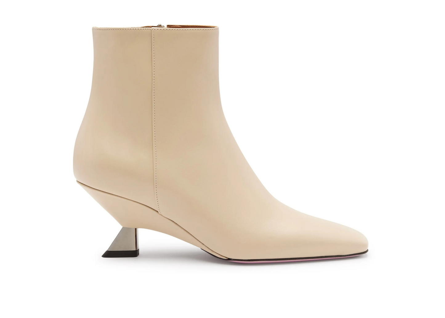 스퀘어 토와 65mm 웨지 힐이 있는 크림 나파 앵클 부츠로, 현대적이고 세련된 우아함을 위해 디자인되었습니다. 측면 지퍼 클로저는 실용적이고 편안한 착용감을 보장하며, 웨지 힐은 실루엣에 균형과 활력을 더합니다. 현대적인 디자인, 일상적인 편안함, 그리고 시대를 초월한 스타일을 결합한 강렬한 개성의 모델입니다.
