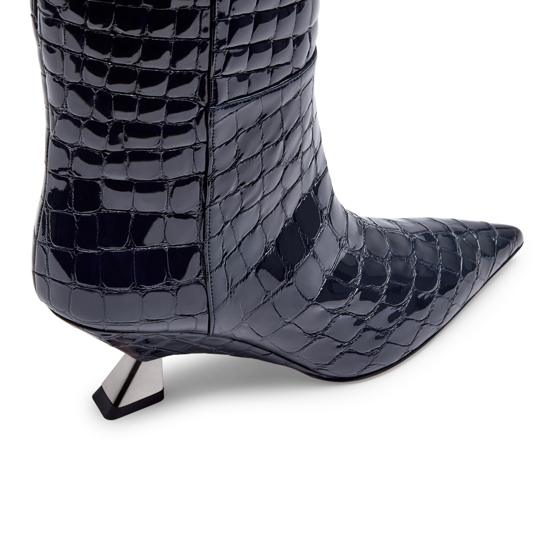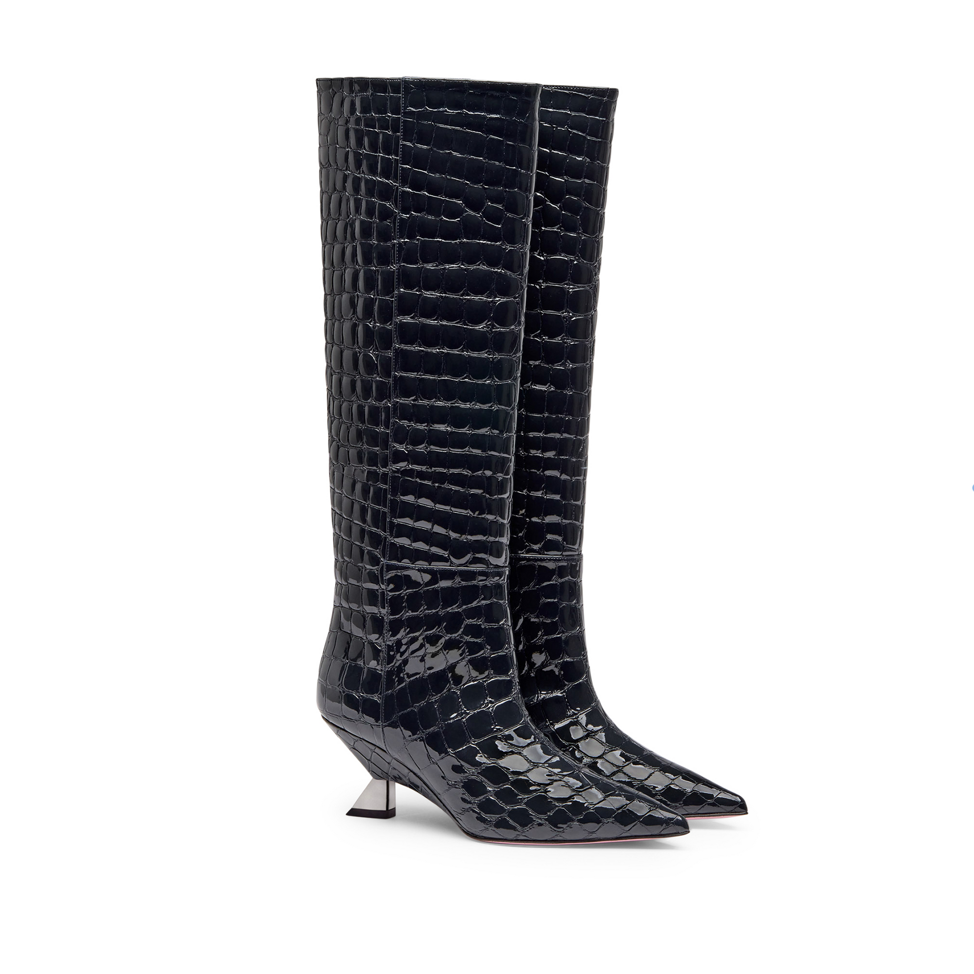 광택 있는 아이언 코코 무늬 부츠로 뾰족한 앞코와 65mm 웨지 힐이 특징입니다. 지퍼가 없는 튜브형 부츠통은 즉각적인 착용감을 제공하며, 옆선의 솔기는 구조감과 개성을 더해줍니다. 웨지 힐은 실루엣에 균형과 활력을 부여하여, 강렬한 개성의 이 모델을 현대적인 디자인과 완벽하게 조화시킵니다.