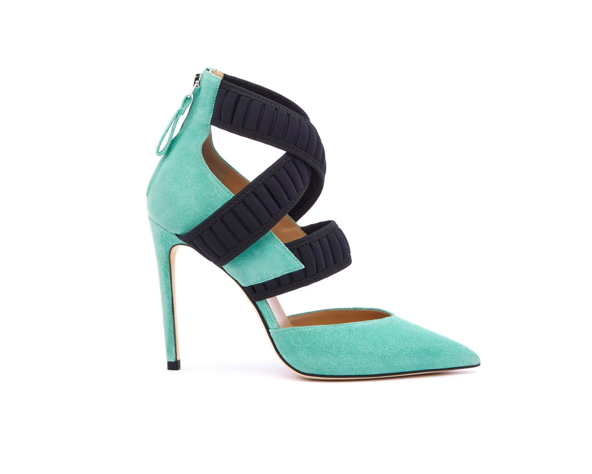 뾰족한 앞코와 곡선형 네크라인이 돋보이는 말디브 스웨이드 데콜테 슈즈입니다. 디자인은 두 개가 교차된 세 개의 검은색 볼륨 네오프렌 스트랩으로 우아하게 발등과 발목을 감싸 안정감과 지지력을 제공합니다. 실용적이고 은은한 뒷지퍼 클로저가 있습니다. 100mm 스틸레토 힐이 실루엣을 길게 만들어 강렬한 개성을 표현합니다.