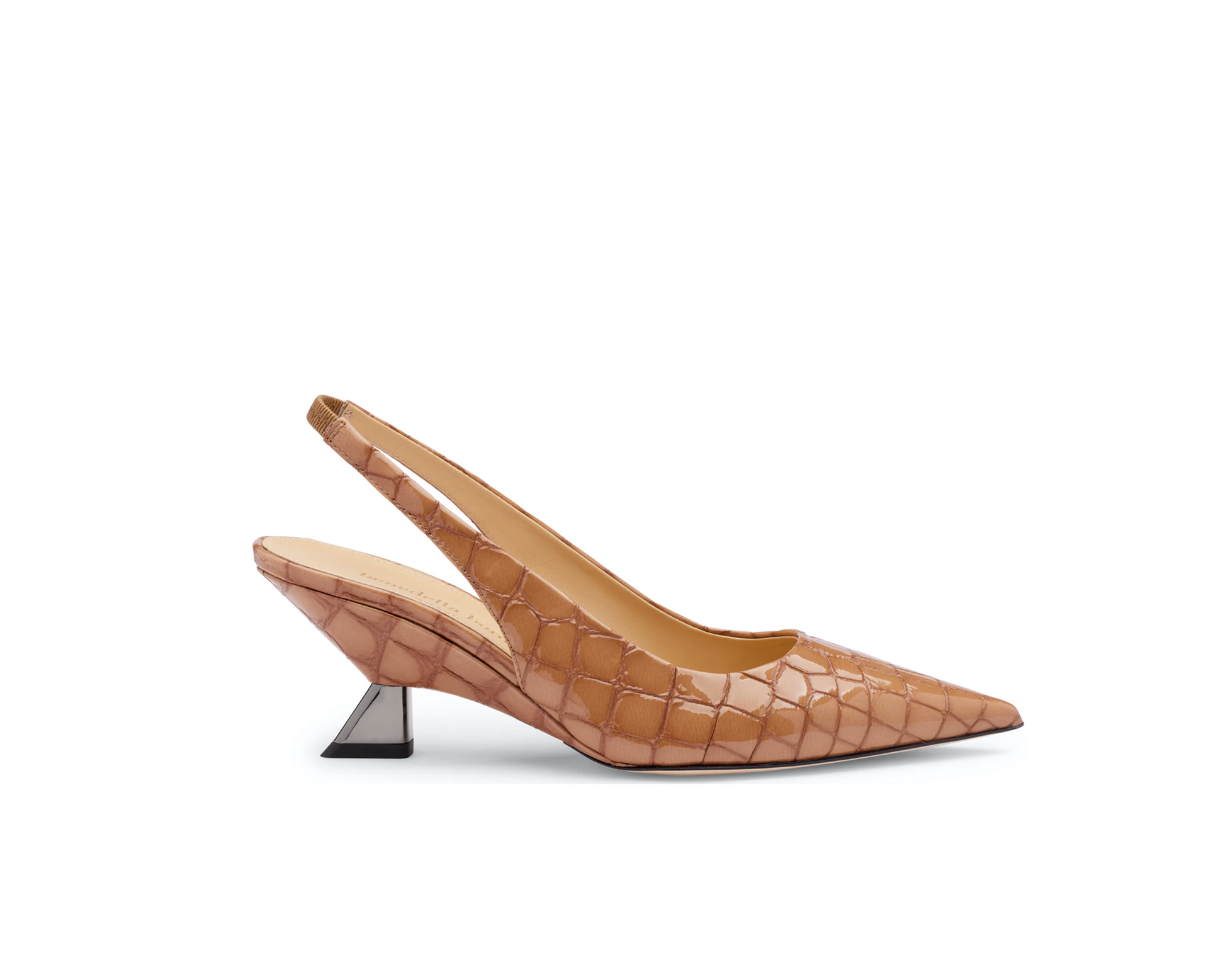광택 있는 코코 무늬 데저트 슬링백, 뾰족한 앞코와 절제된 디자인으로 세련미를 강조합니다. 뒤쪽의 밴딩은 안정적이고 편안한 착용감을 보장하며, 상징적인 65mm 웨지 힐은 적절한 지지력과 장시간 착용 시에도 편안함을 제공합니다. 아침부터 저녁까지 우아함을 잃지 않고 신을 수 있도록 고안된 모델입니다.