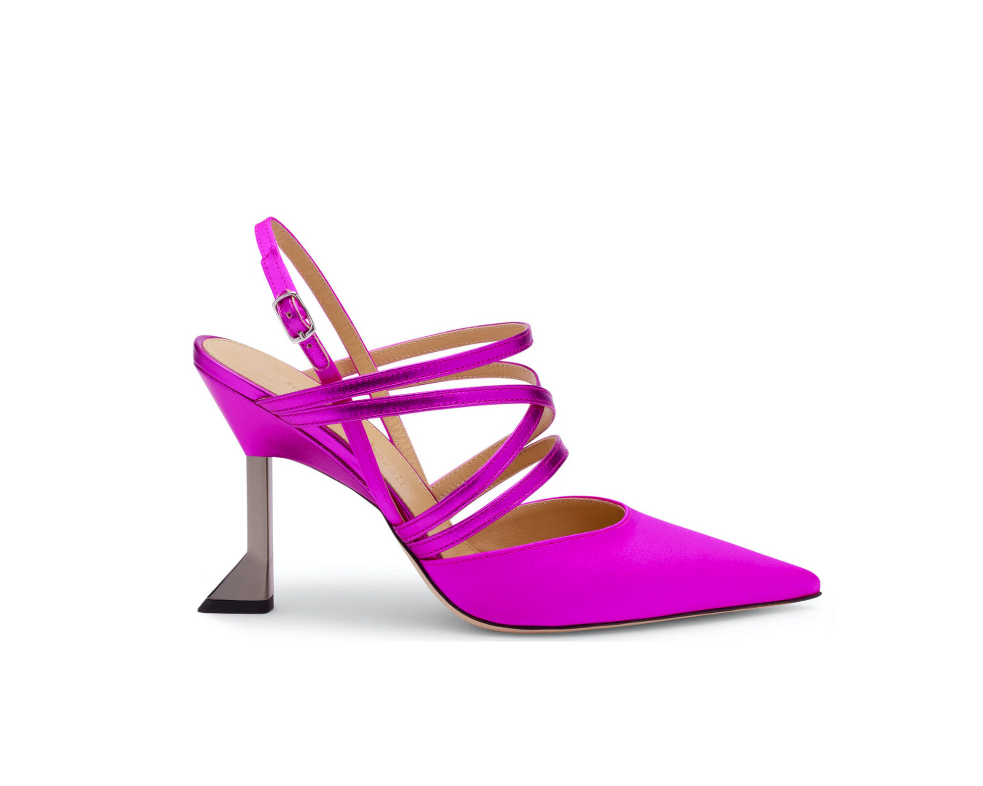 새틴 푸시아 색상의 뾰족한 몰리 슬링백은 여성스러운 우아함의 상징입니다.