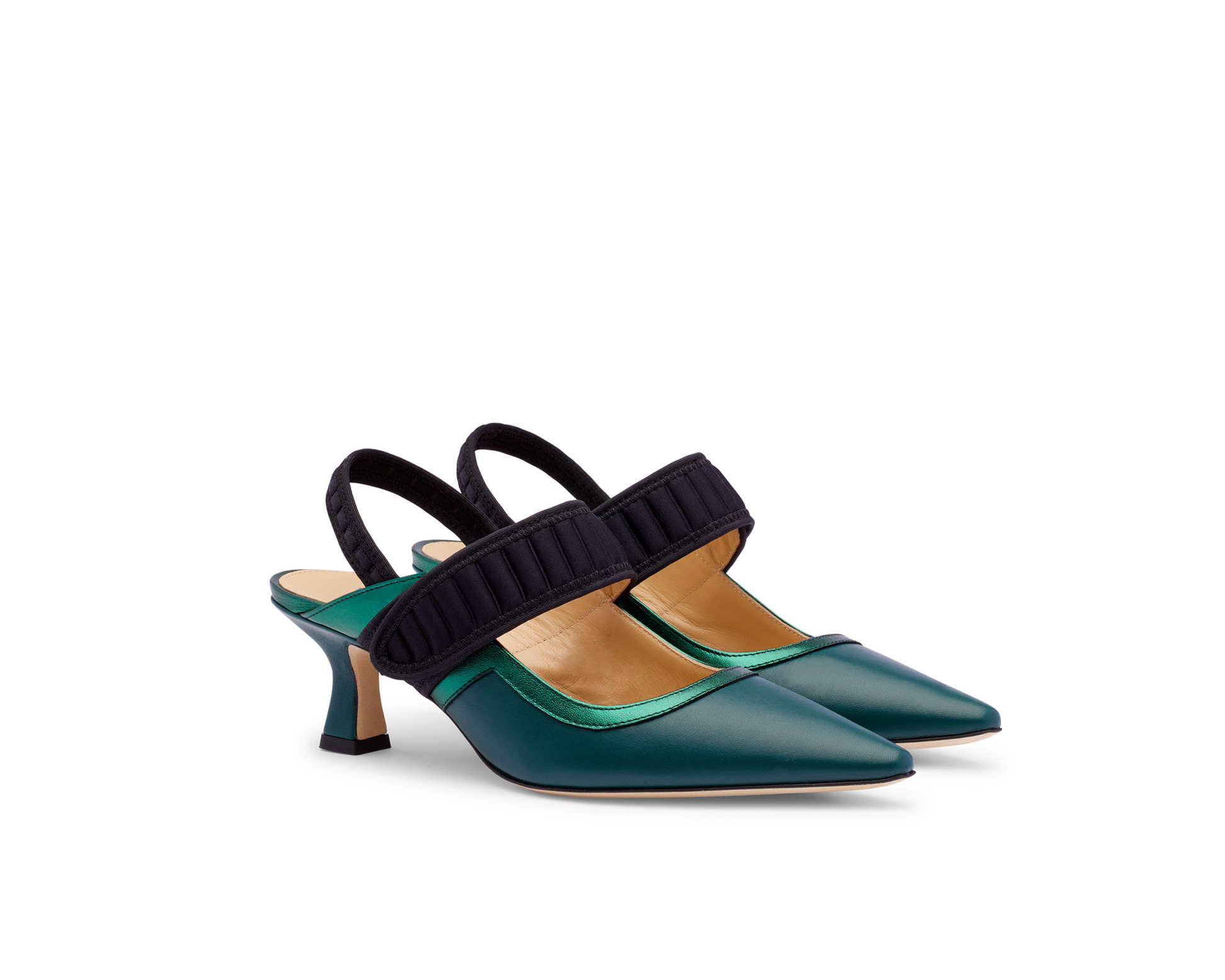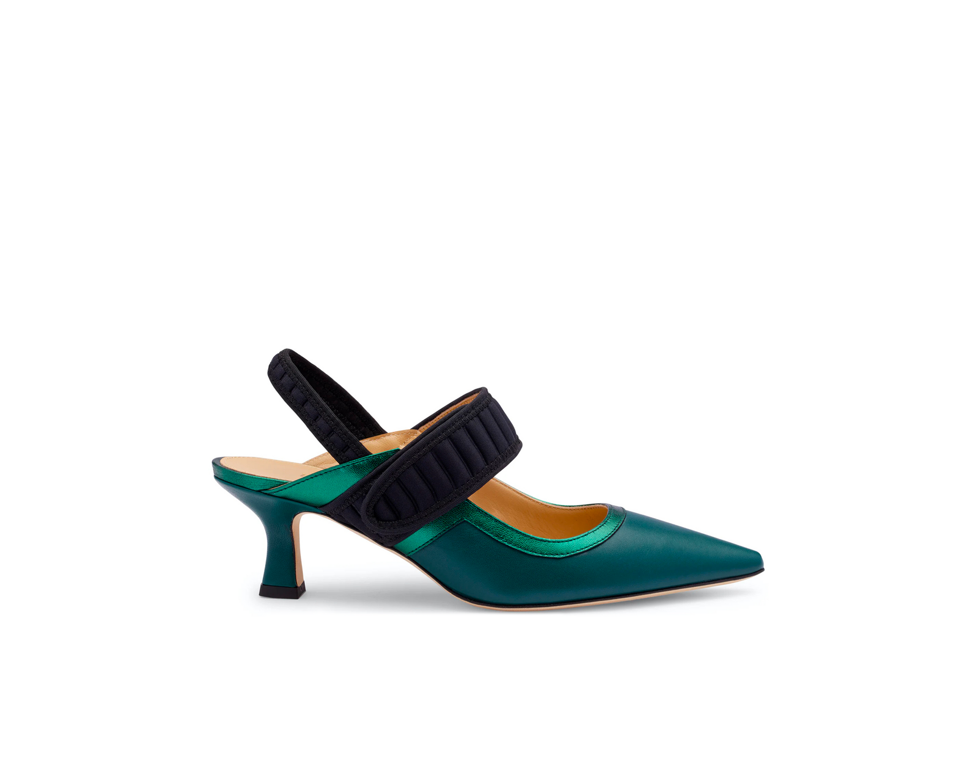 슬링백 나파 페트롤리오 소재로 뾰족한 앞코, 조절 가능한 볼륨감 있는 검은색 네오프렌 벨크로 클로저와 얇은 뒤꿈치 스트랩이 특징입니다. 녹색 나파 라미네이트 트리밍 디테일이 디자인을 완성합니다. 65mm 웨지 힐은 장시간 착용해도 편안하도록 설계되어 아침부터 저녁까지 완벽하게 함께할 수 있습니다.