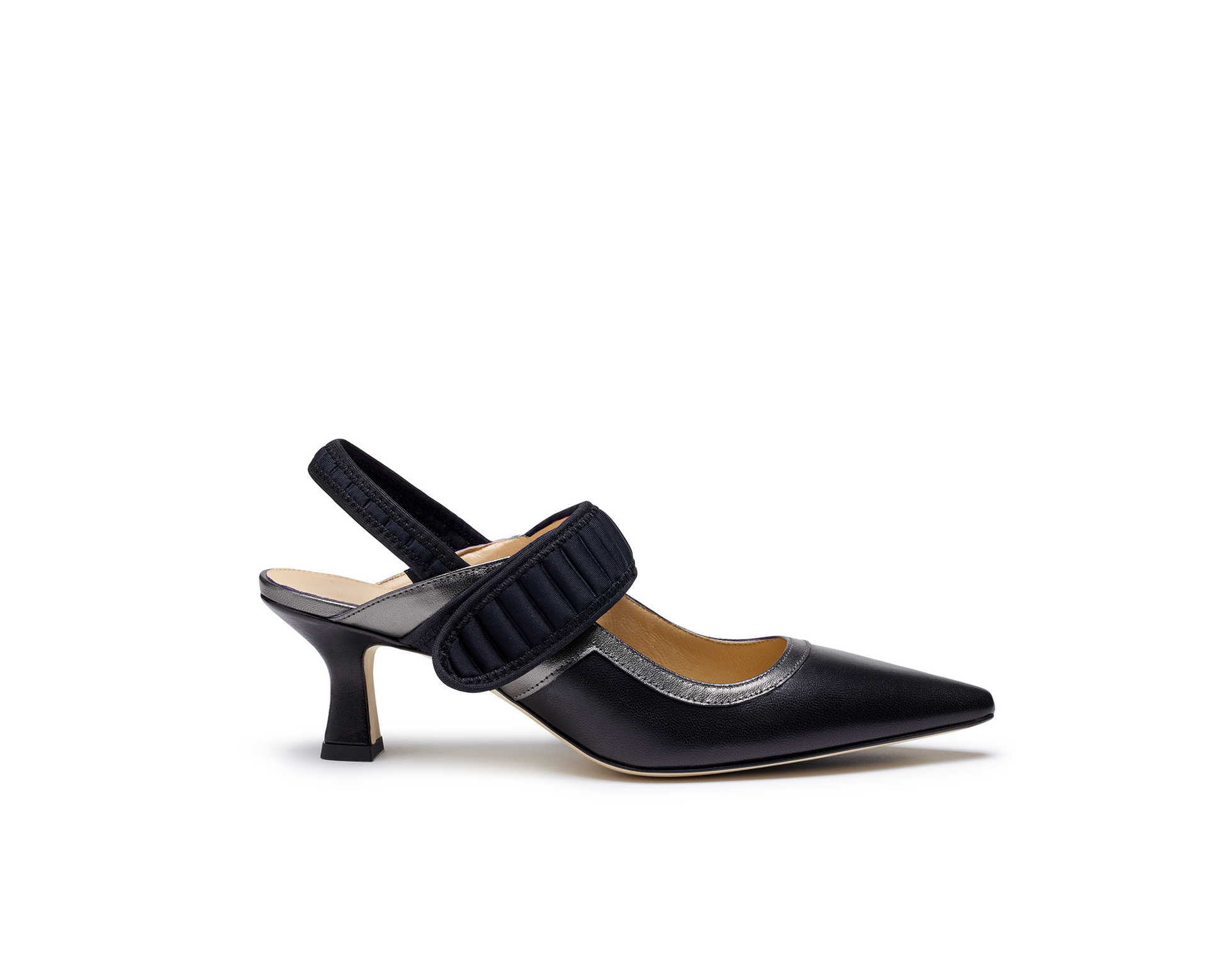 뾰족한 앞코의 블랙 나파 가죽 슬링백, 조절 가능한 볼륨감 있는 블랙 네오프렌 벨크로 클로저와 얇은 뒤꿈치 스트랩. 안트라사이트 래미네이트 나파 가죽 트리밍 디테일이 디자인을 완성합니다. 65mm 웨지 힐로 장시간 착용해도 편안하며 아침부터 저녁까지 완벽하게 함께할 수 있습니다.