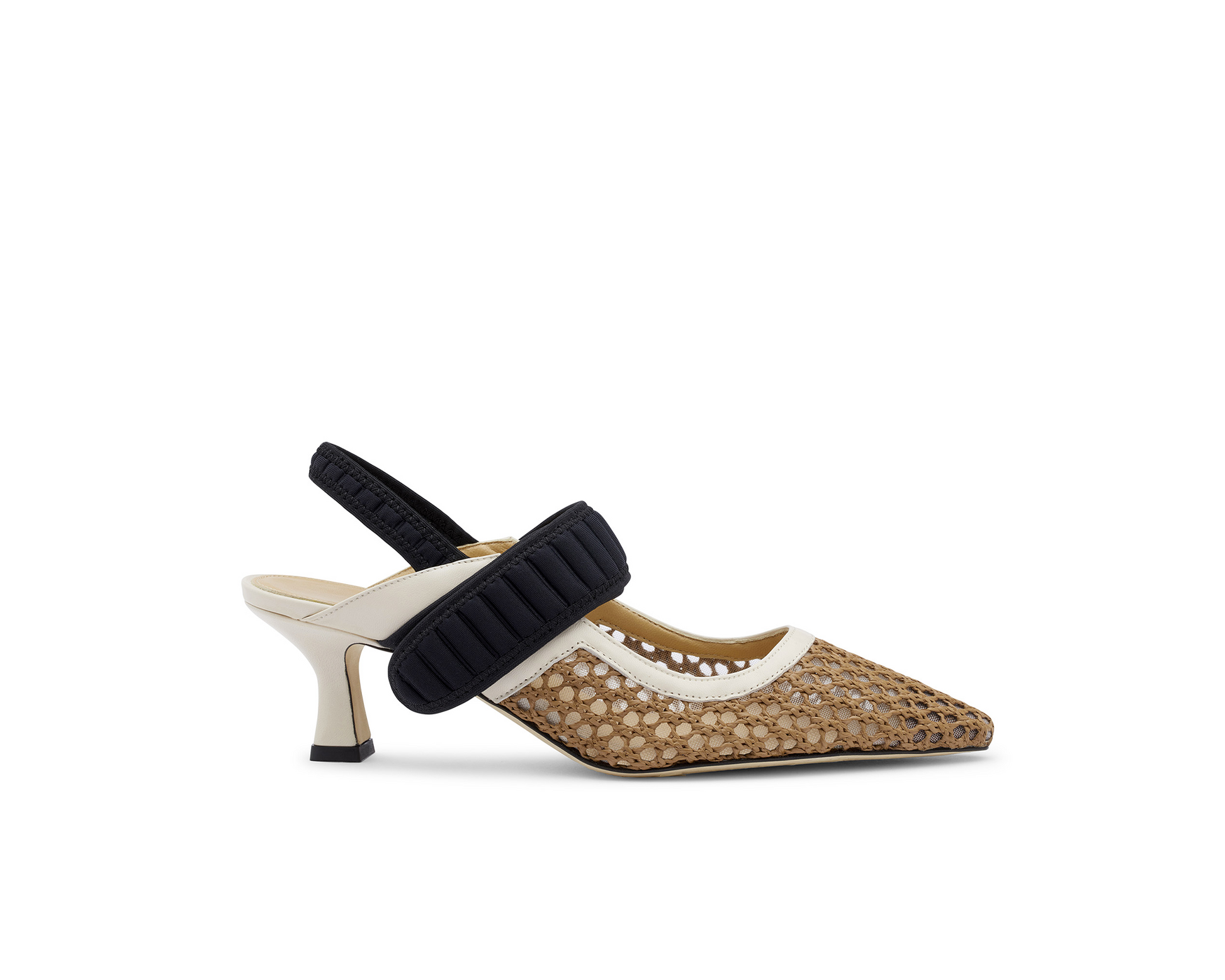 뾰족한 앞코가 있는 카프리 네트 슬링백, 조절 가능한 볼륨감 있는 검은색 네오프렌 벨크로 클로저와 얇은 뒤꿈치 스트랩. 크림색 나파 가죽 트리밍 디테일이 디자인을 완성합니다. 65mm 웨지 힐로 장시간 착용해도 편안하며 아침부터 저녁까지 완벽하게 함께할 수 있습니다.