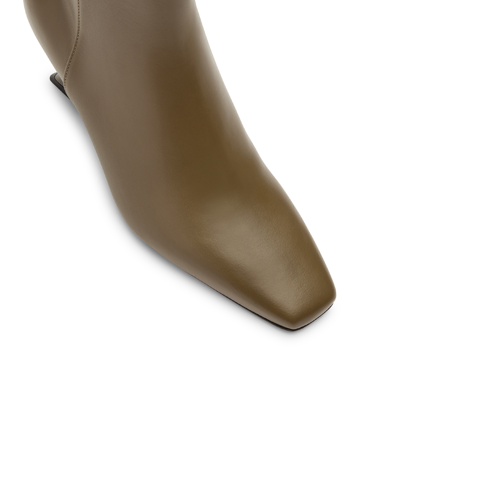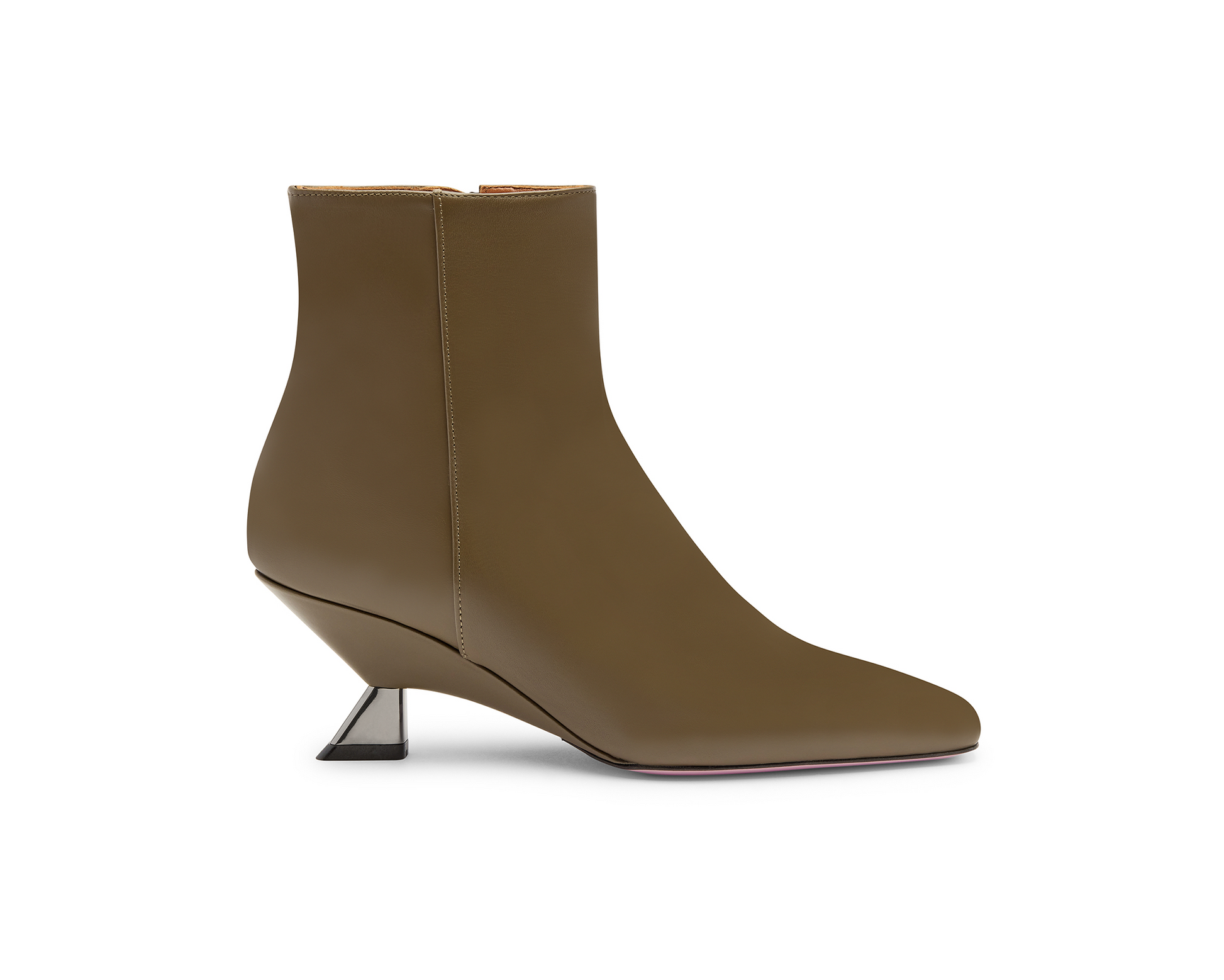 모던하고 세련된 우아함을 위해 디자인된 65mm 웨지 힐과 네모난 앞코가 특징인 카키 나파 가죽 앵클 부츠입니다. 측면 지퍼 클로저는 실용적이고 편안한 착용감을 보장하며, 웨지 힐은 실루엣에 균형과 활력을 더해줍니다. 현대적인 디자인, 일상적인 편안함, 그리고 시대를 초월한 스타일을 결합한 강렬한 개성의 모델입니다.