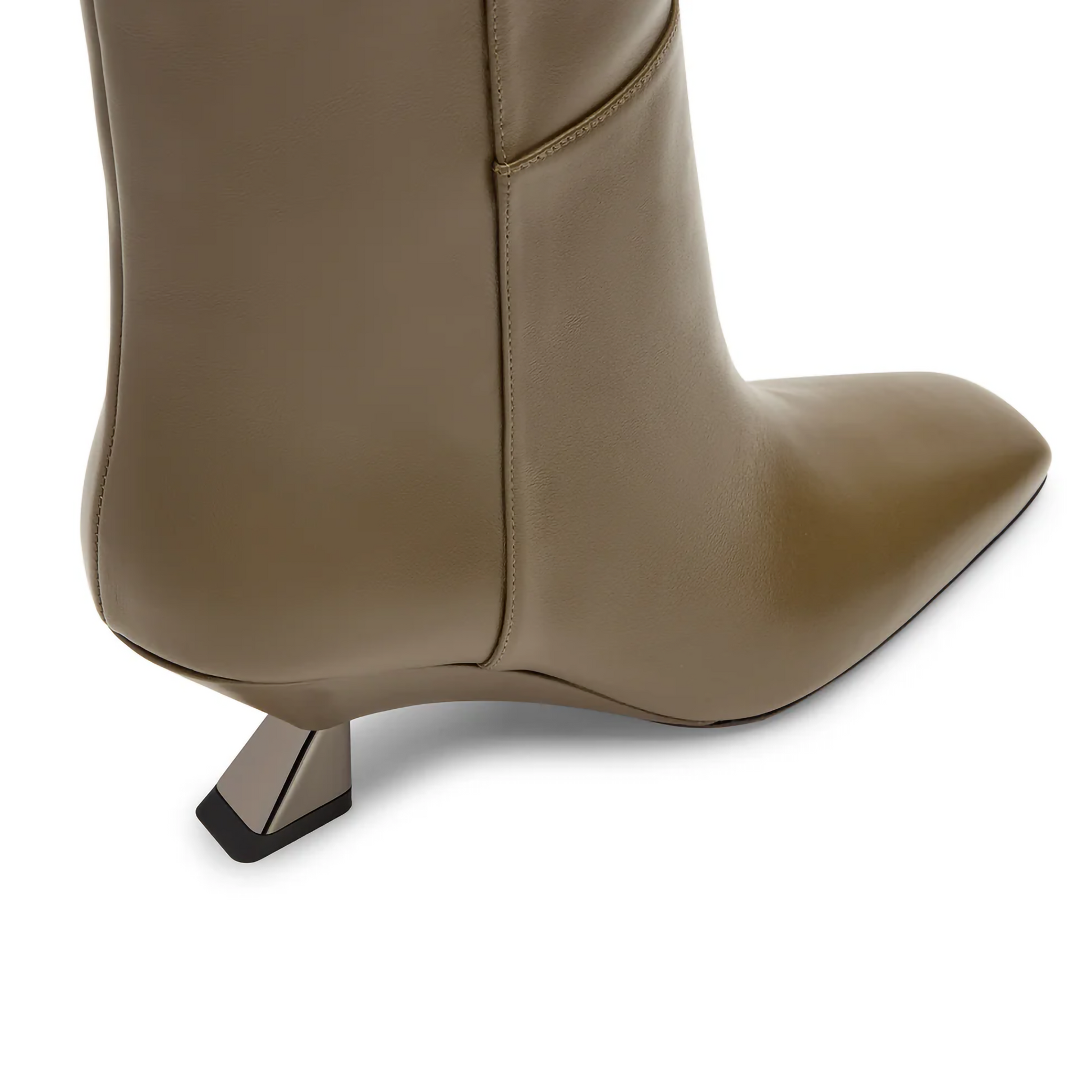 모던하고 세련된 우아함을 위해 디자인된 65mm 웨지 힐과 네모난 앞코가 특징인 카키 나파 가죽 부츠입니다. 지퍼가 없는 튜브형 부츠통은 즉각적인 착용감을 보장하며, 옆선의 스티치는 구조감과 개성을 더합니다. 웨지 힐은 실루엣에 균형과 활력을 부여하여, 강렬한 개성을 지닌 이 모델을 현대적인 디자인의 완벽한 조합으로 만듭니다.