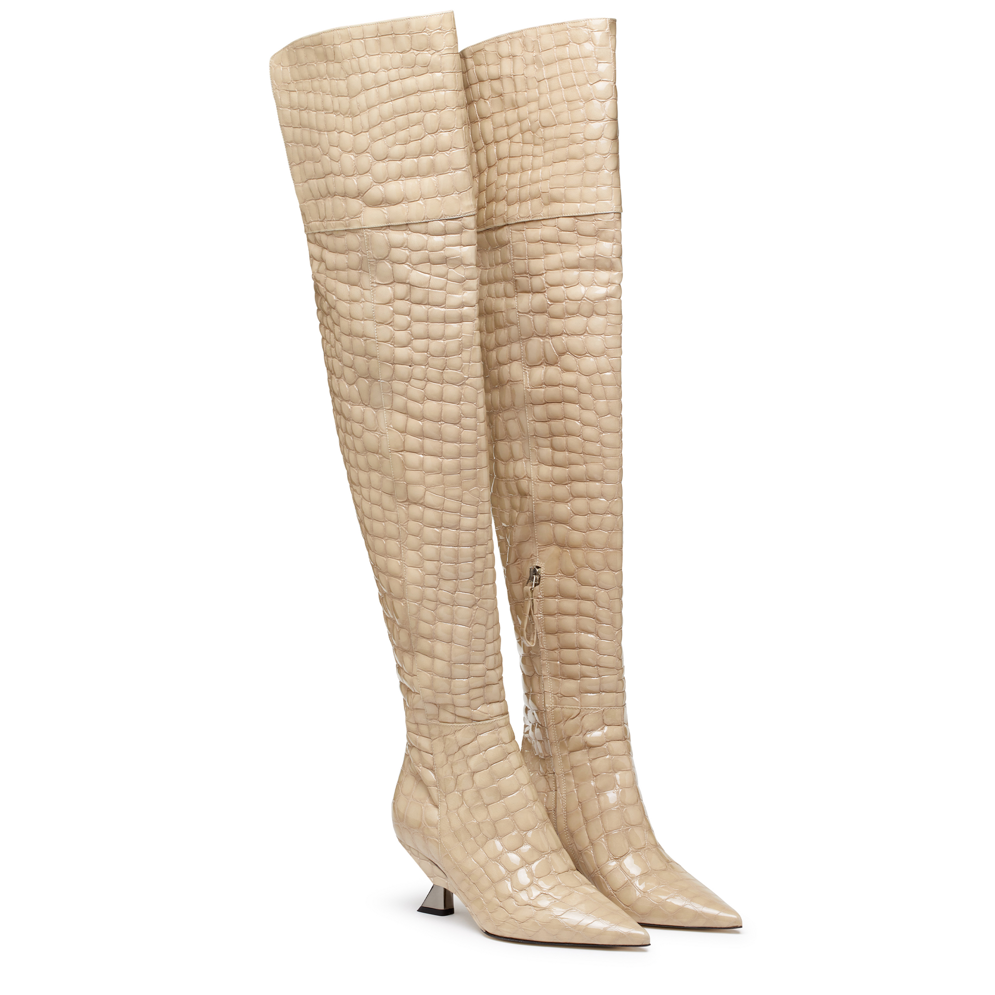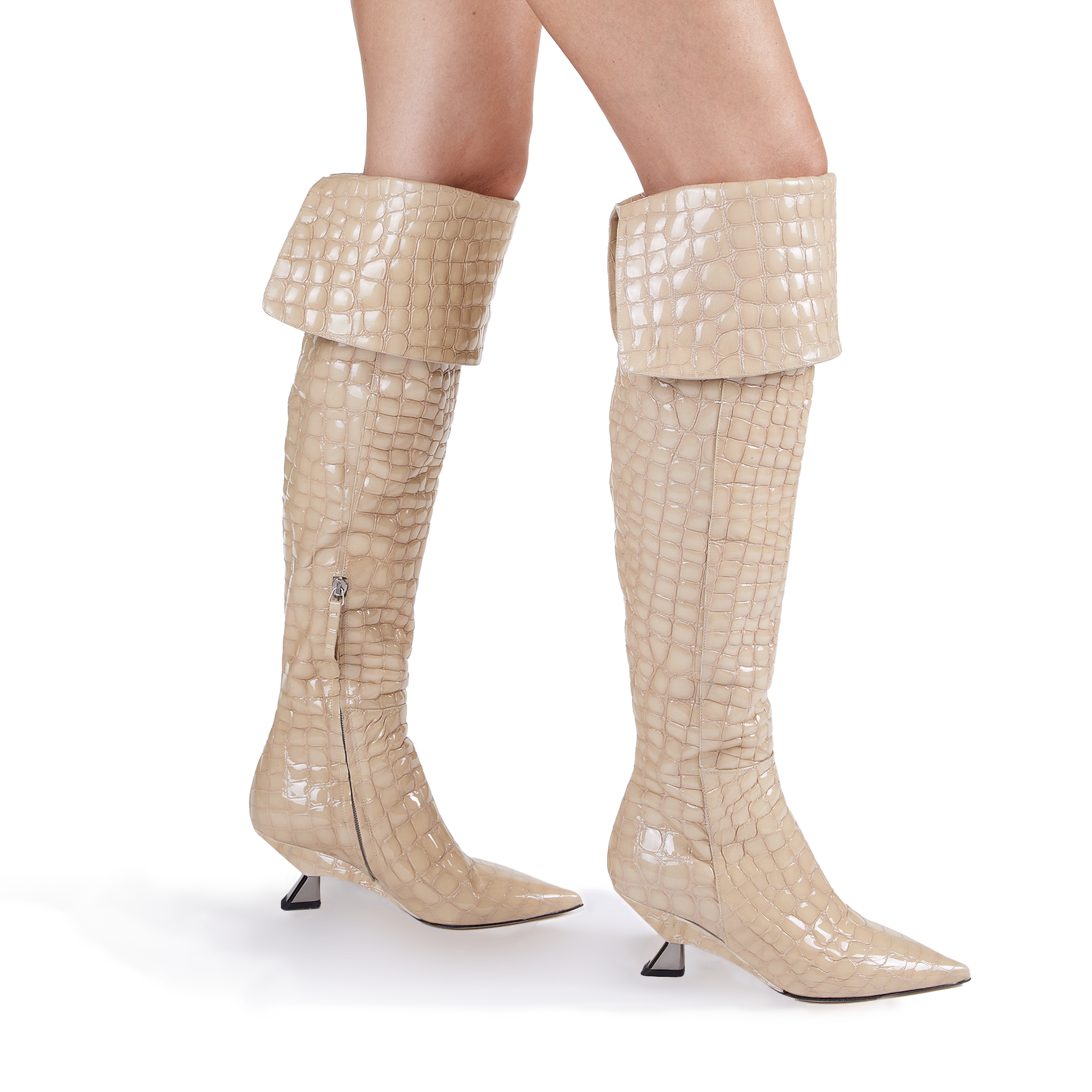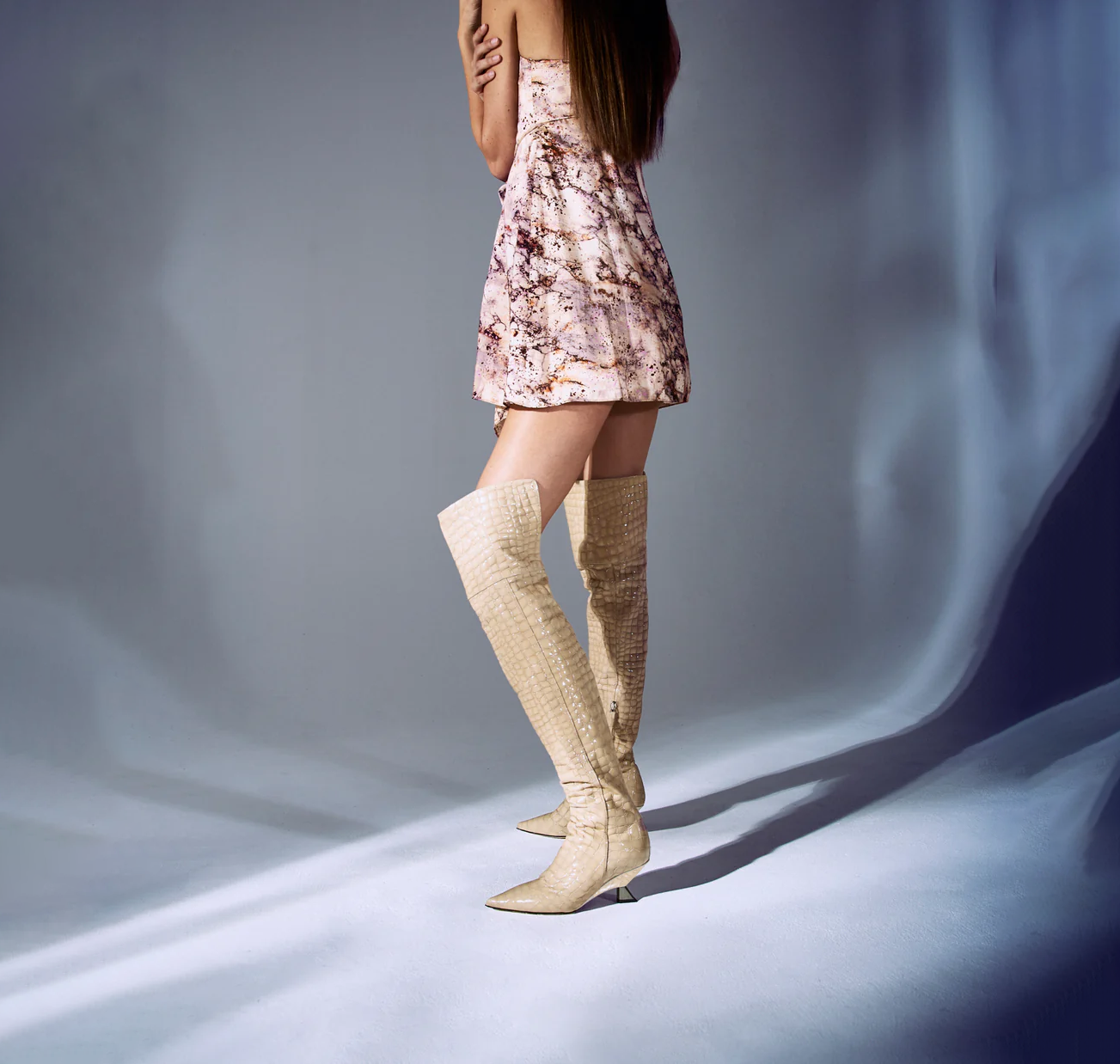 모델 피오나의 코코 샌드 프린트 부츠는 그 다재다능함으로 돋보입니다: 무릎 위로 높게 착용하여 멋진 실루엣을 연출하거나, 무릎 아래로 롤업하여 더 실용적인 룩을 연출하거나, 낮고 주름진 스타일로 더 스포티하고 편안한 느낌을 줄 수 있습니다.
