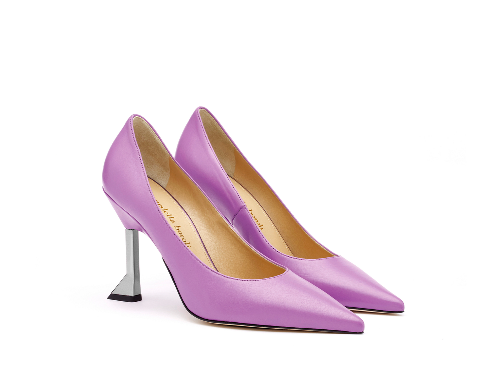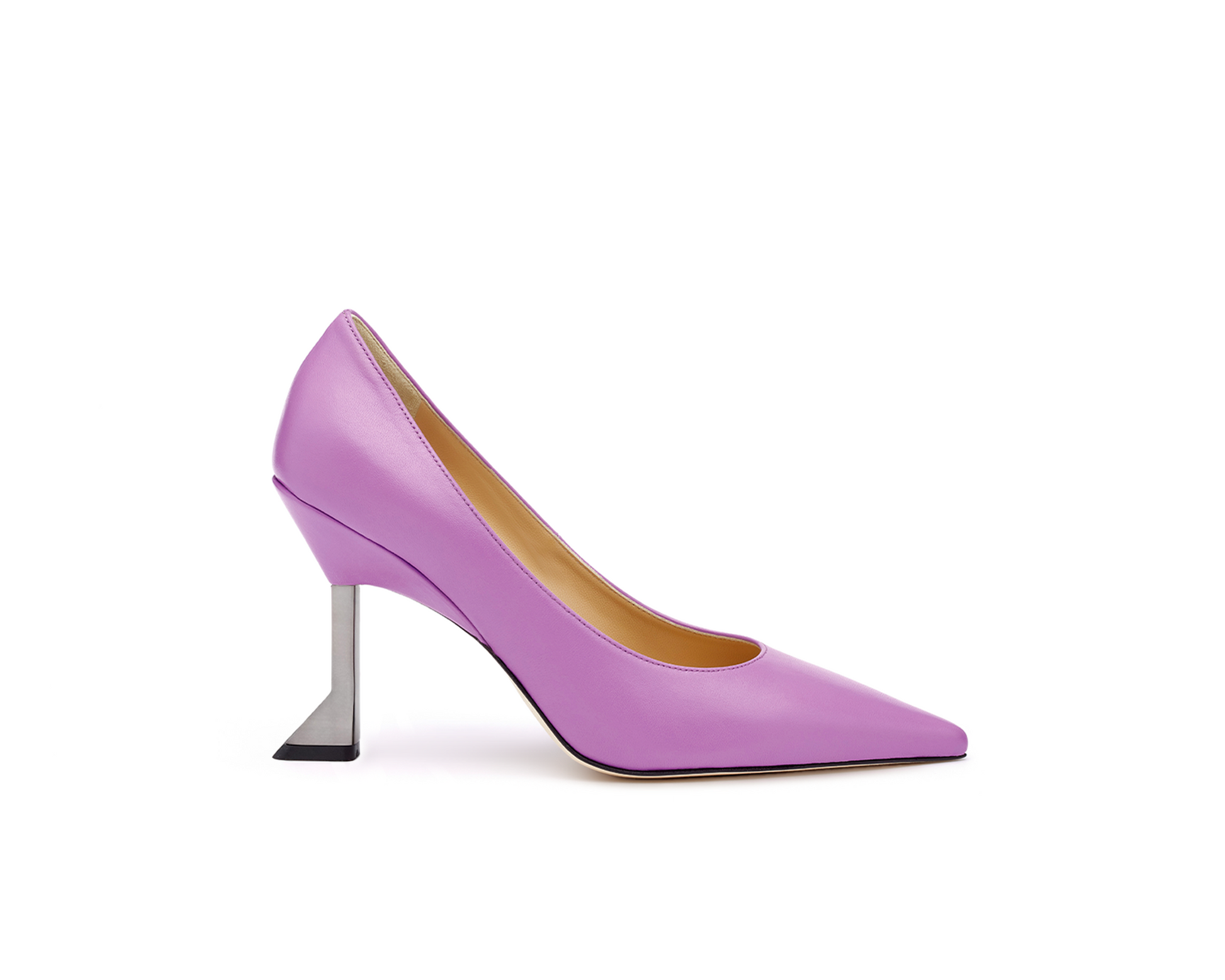 뾰족한 앞코와 곡선형 네크라인이 돋보이는 라벤더 나파 가죽 데콜테 슈즈입니다. 90mm 웨지 힐이 기하학적이고 대담한 느낌을 주며, 클래식한 디자인을 현대적으로 재해석했습니다. 시대를 초월한 우아함과 현대적인 디자인의 완벽한 균형을 이룹니다.