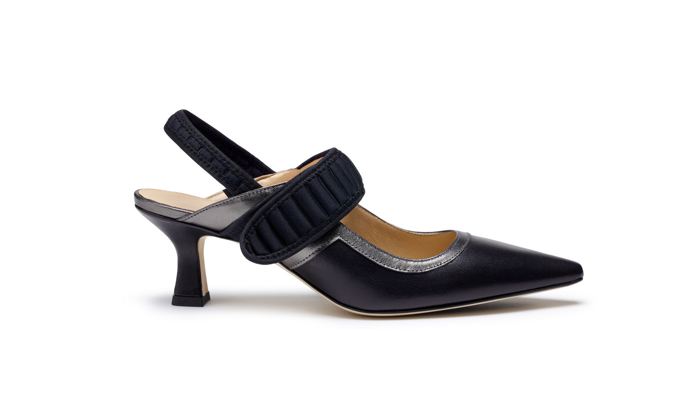 Slingback in nappa Nero con punta affusolata, chiusura a velcro in neoprene nero bombato regolabile e fascia sottile sul tallone. Dettagli in bordatura in nappa laminata antracite completano il design. Tacco zeppa da 65 mm, studiato per un comfort prolungato, perfetto per accompagnarti dalla mattina alla sera.