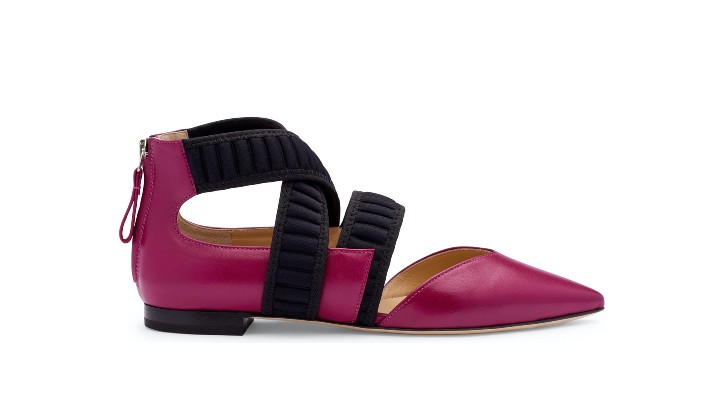 La ballerina di lusso che evoca la modernità del design composito e il brio della nuance vivace. La femminilità della forma allungata, il comfort del tacco basso.
