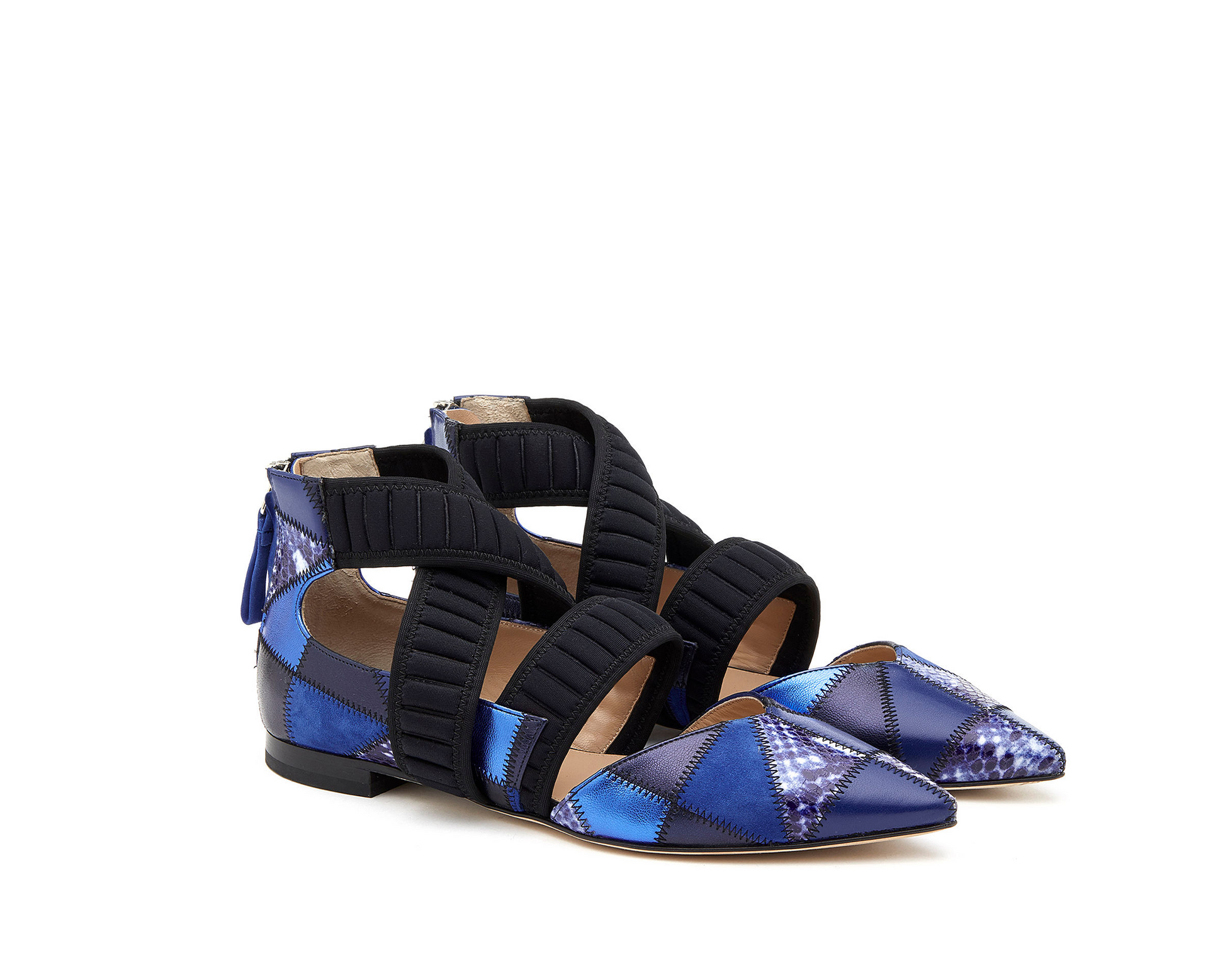 Il patchwork dai colori blu brillanti rende la scarpa preziosa, le fasce in neoprene la rendono confortevole.