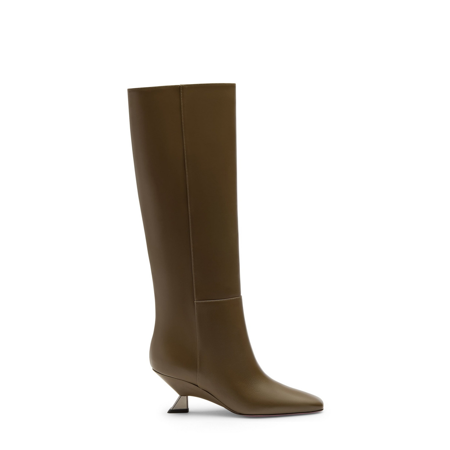 Stivale in nappa Khaki con punta quadrata e tacco zeppa da 65 mm, pensato per un’eleganza moderna e disinvolta. Il gambale a tubo, privo di zip, assicura una calzata immediata mentre le cuciture laterali donano struttura e carattere. La zeppa conferisce equilibrio e slancio alla silhouette, rendendo questo modello dal carattere deciso una perfetta combinazione di design contemporaneo.