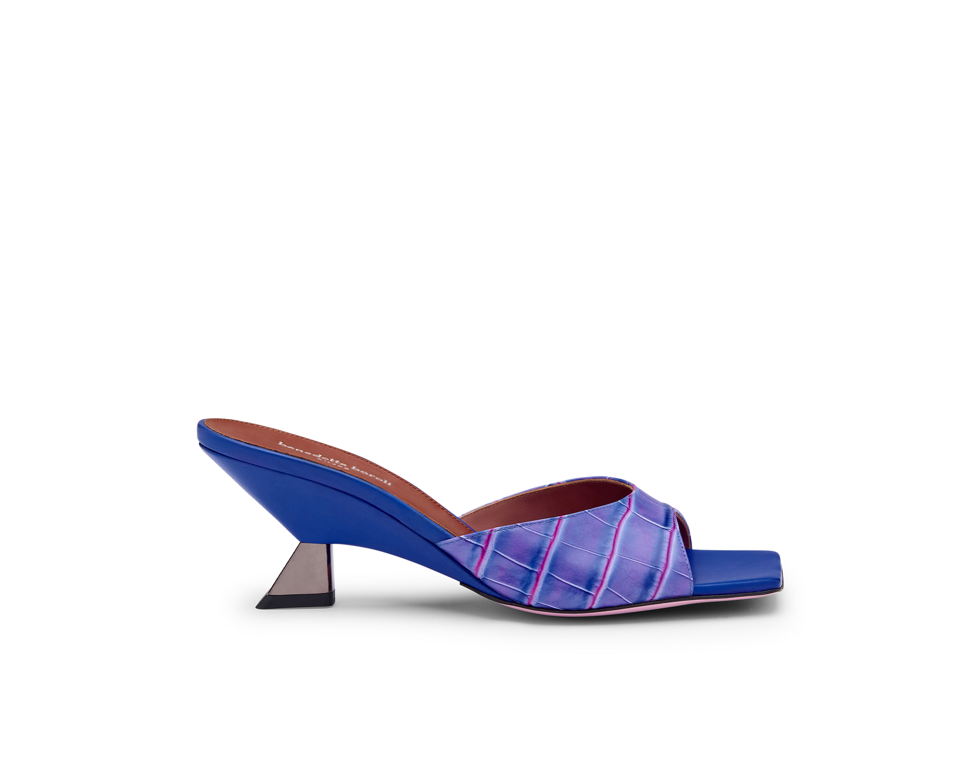 ll sandalo Alyssa in stampa cocco cobalto presenta uno scollo pronunciato, una moderna punta quadrata e l’iconico tacco zeppa di altezza 65mm.