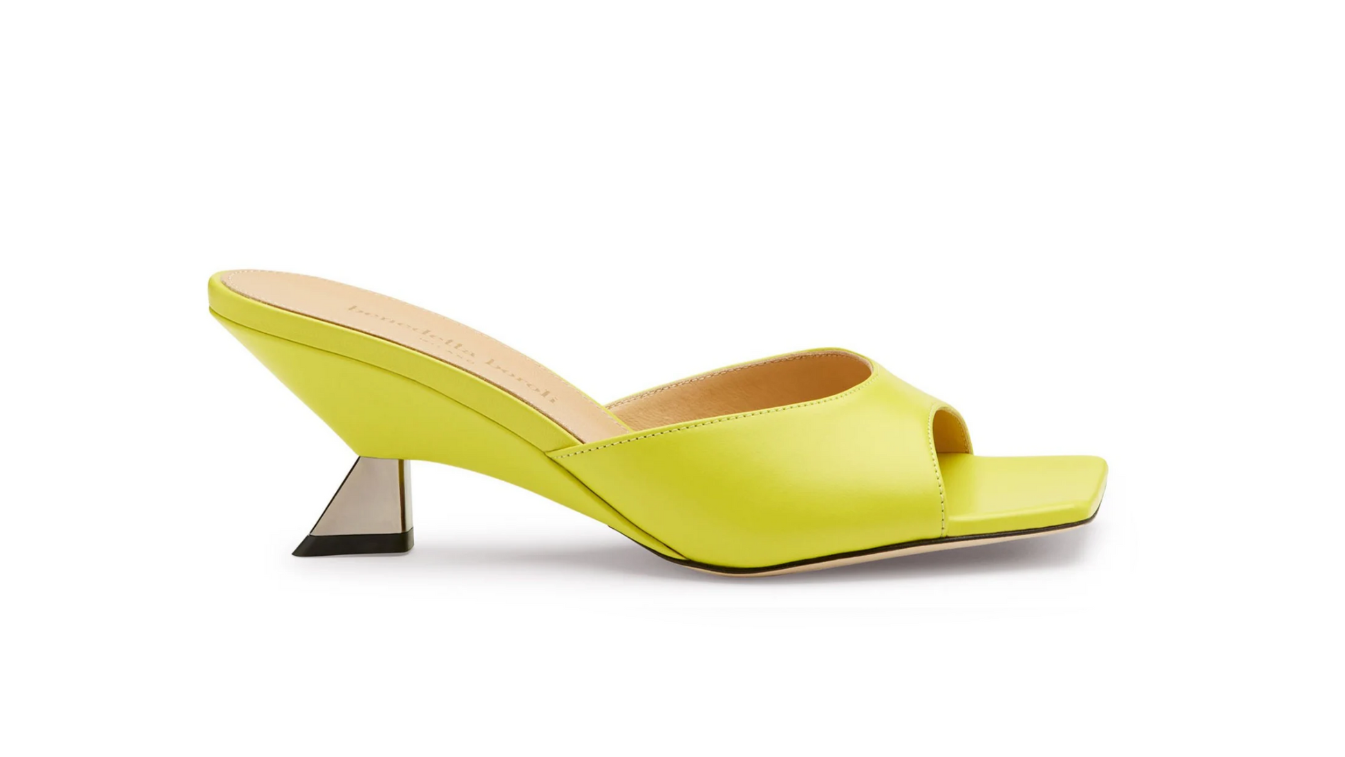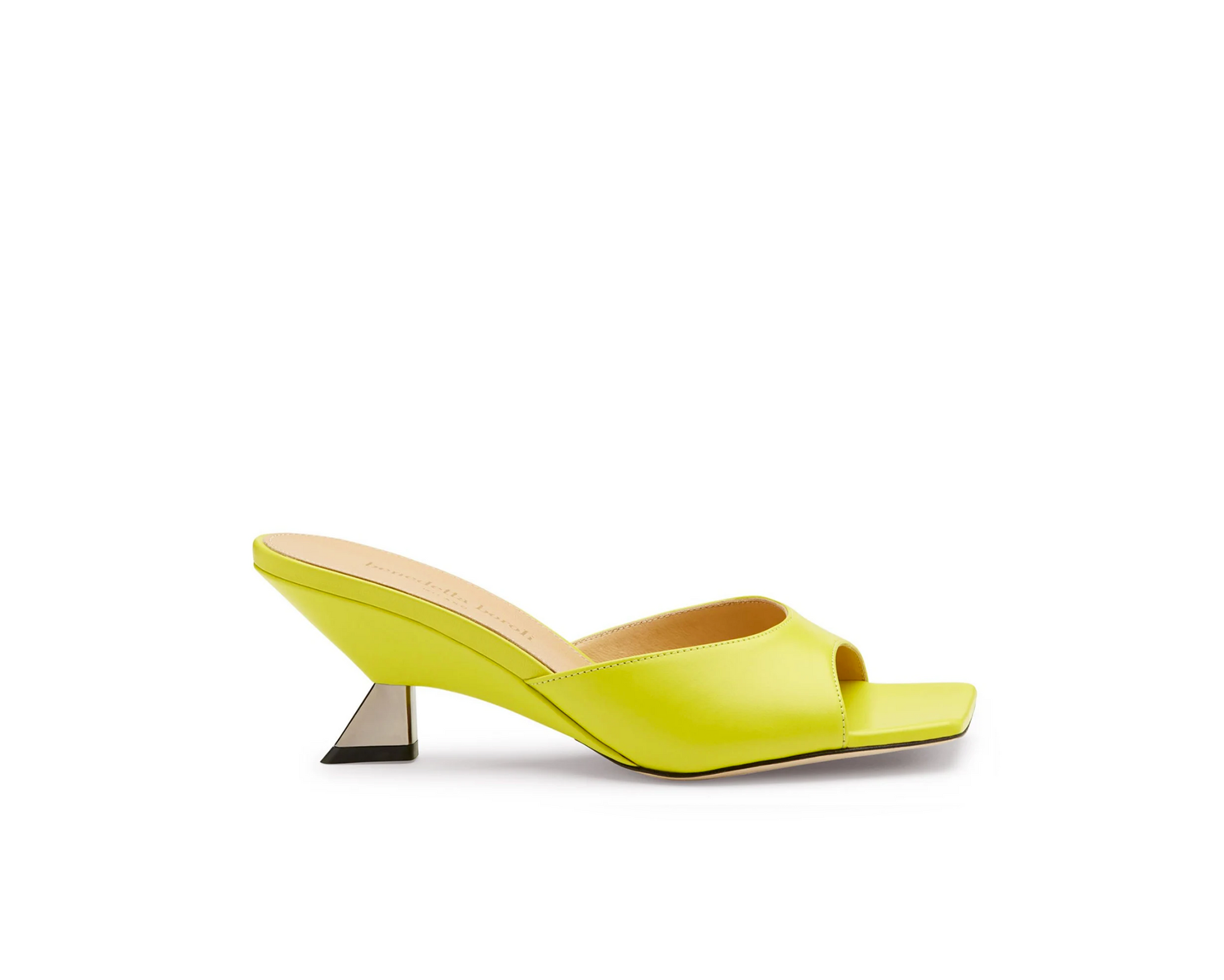 Il sandalo Alyssa in nappa margarita presenta uno scollo pronunciato, una moderna punta quadrata e l’iconico tacco zeppa di altezza 65mm.