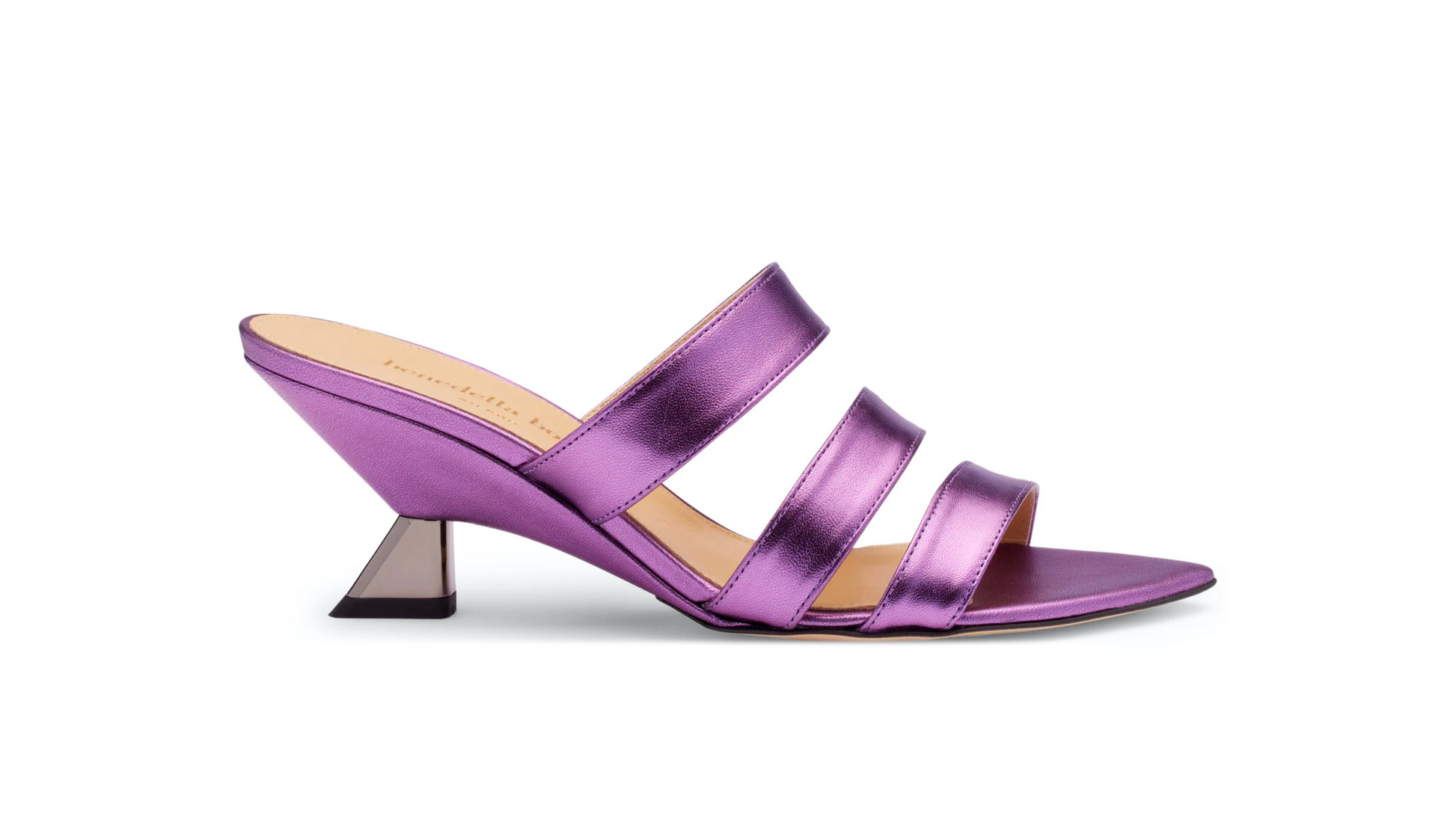 Sandalo elegante in nappa laminata glicine, caratterizzato da un design raffinato e da una struttura a tre fasce, realizzate in morbida nappa laminata per avvolgere con precisione il collo del piede garantendo supporto e comfort. La silhouette affusolata è accentuata da una punta leggermente allungata, pensata per slanciare la figura e valorizzare la linea del piede. Completato da un tacco zeppa da 65 mm, stabile e ben bilanciato, assicura una camminata fluida e leggera, ideale per un’eleganza disinvolta in ogni momento della giornata.