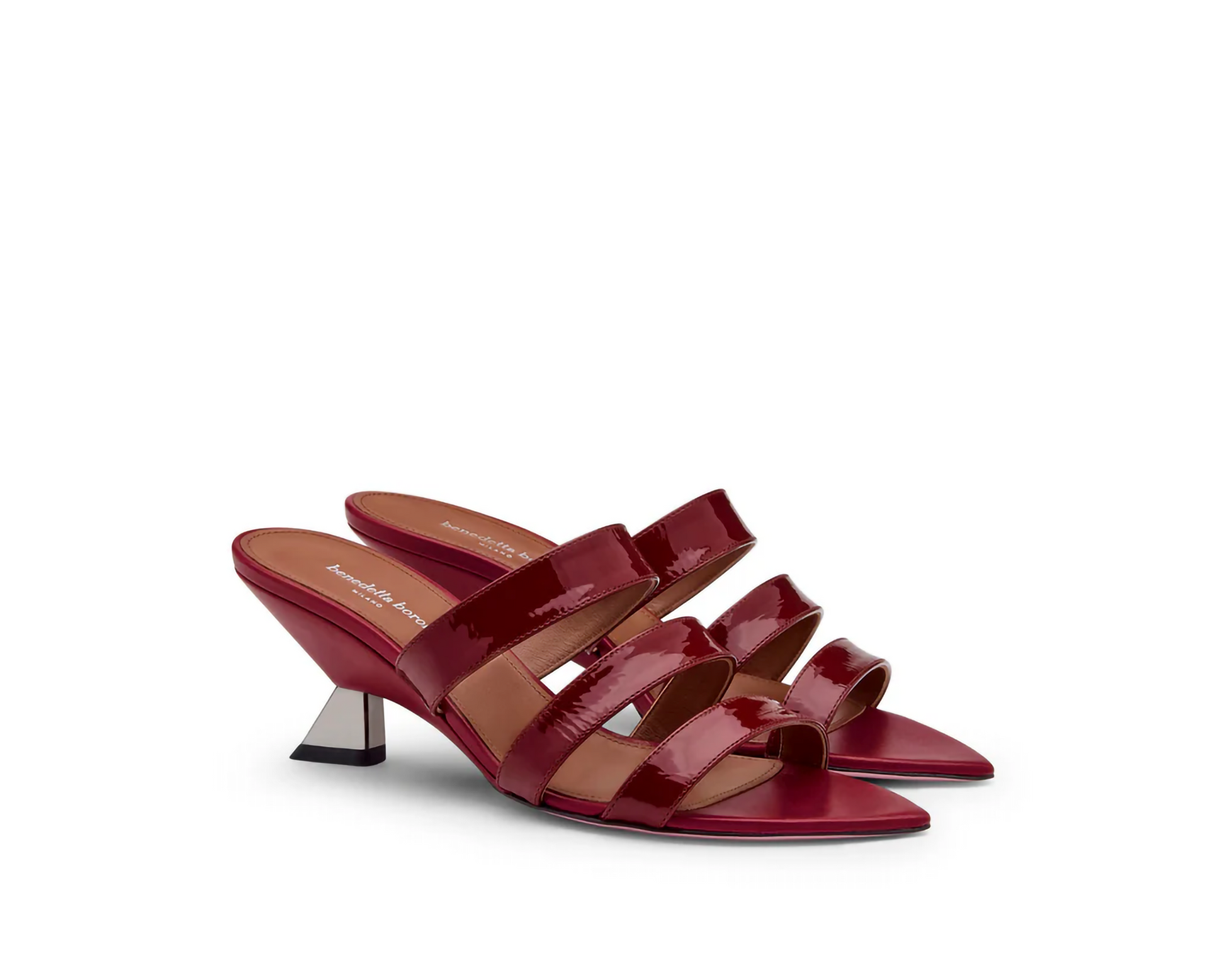 Sandalo in vernice Ribes caratterizzato da struttura a tre fasce che avvolgono con precisione il collo del piede, offrendo sostegno e comfort. La silhouette è valorizzata da una punta affusolata, studiata per slanciare la figura e definire con armonia la linea del piede. Il tacco zeppa da 65mm accompagna il passo con leggerezza e fluidità, esprimendo un’eleganza disinvolta pensata per ogni momento della giornata.