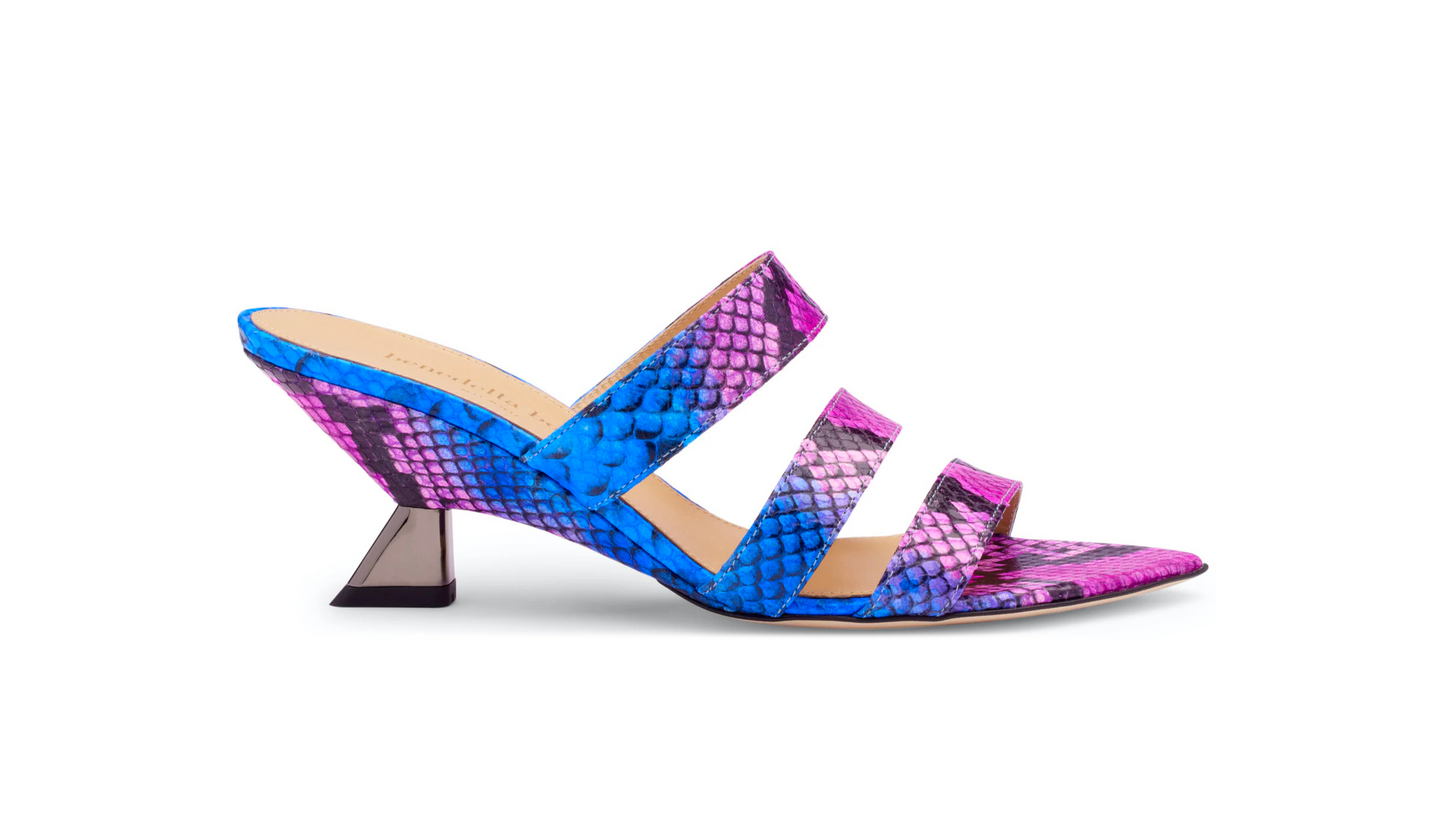 Il sandalo Olivia in stampa pitone multi si distingue per il suo design moderno, caratterizzato da tre eleganti fasce che avvolgono delicatamente il collo del piede.