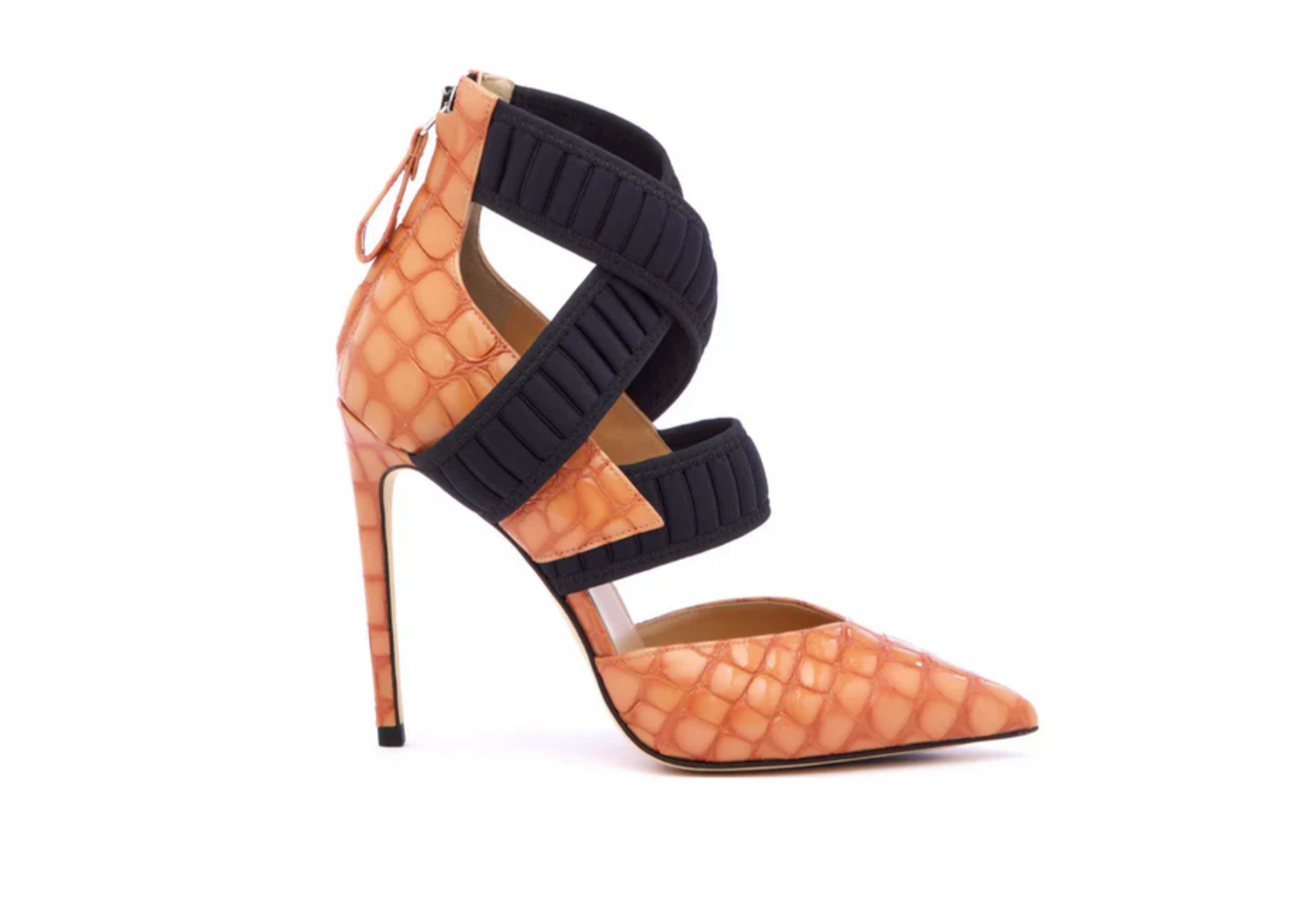 Décolleté in stampa cocco Nespola con punta affusolata e scollatura incurvata. Il design è impreziosito da tre fasce in neoprene bombato nero, di cui due incrociate, che avvolgono con eleganza il collo del piede e la caviglia, assicurando stabilità e sostegno. Zip posteriore per una chiusura pratica e discreta. Il tacco stiletto da 100mm slancia la silhouette e definisce una calzatura dal carattere deciso.