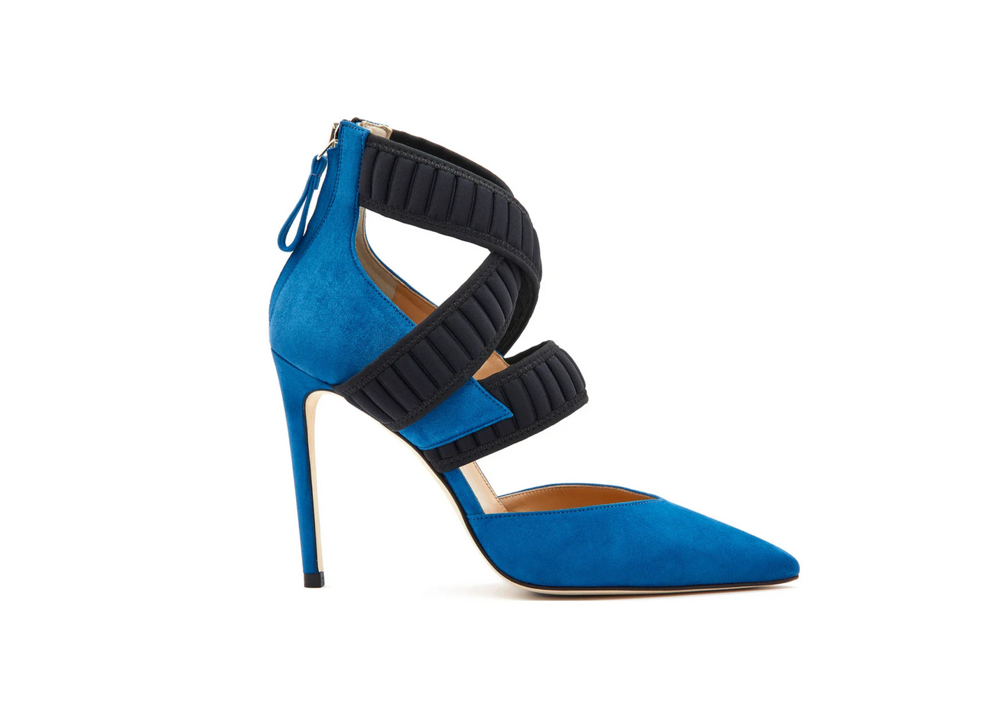 Décolleté in camoscio Ocean con punta affusolata e scollatura incurvata. Il design è impreziosito da tre fasce in neoprene bombato nero, di cui due incrociate, che avvolgono con eleganza il collo del piede e la caviglia, assicurando stabilità e sostegno. Zip posteriore per una chiusura pratica e discreta. Il tacco stiletto da 100mm slancia la silhouette e definisce una calzatura dal carattere deciso.