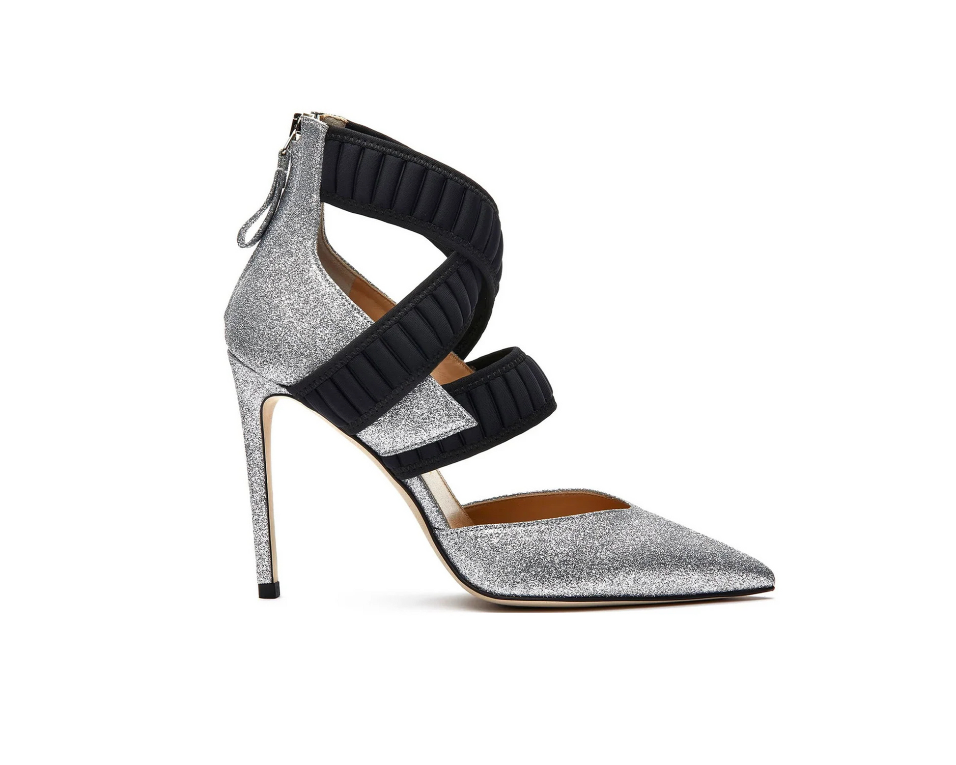 Décolleté in nappa glitter Argento con punta affusolata e scollatura incurvata. Il design è impreziosito da tre fasce in neoprene bombato nero, di cui due incrociate, che avvolgono con eleganza il collo del piede e la caviglia, assicurando stabilità e sostegno. Zip posteriore per una chiusura pratica e discreta. Il tacco stiletto da 100mm slancia la silhouette e definisce una calzatura dal carattere deciso.