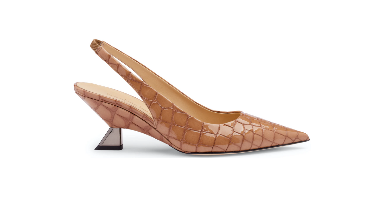 Slingback in stampa cocco lucido Deserto con punta affusolata, dal design essenziale che ne sottolinea la raffinatezza. L’elastico posteriore assicura una calzata stabile e confortevole, mentre l’iconico tacco zeppa da 65 mm garantisce il giusto supporto e un comfort prolungato. Un modello pensato per essere indossato dalla mattina alla sera, senza rinunciare all’eleganza.