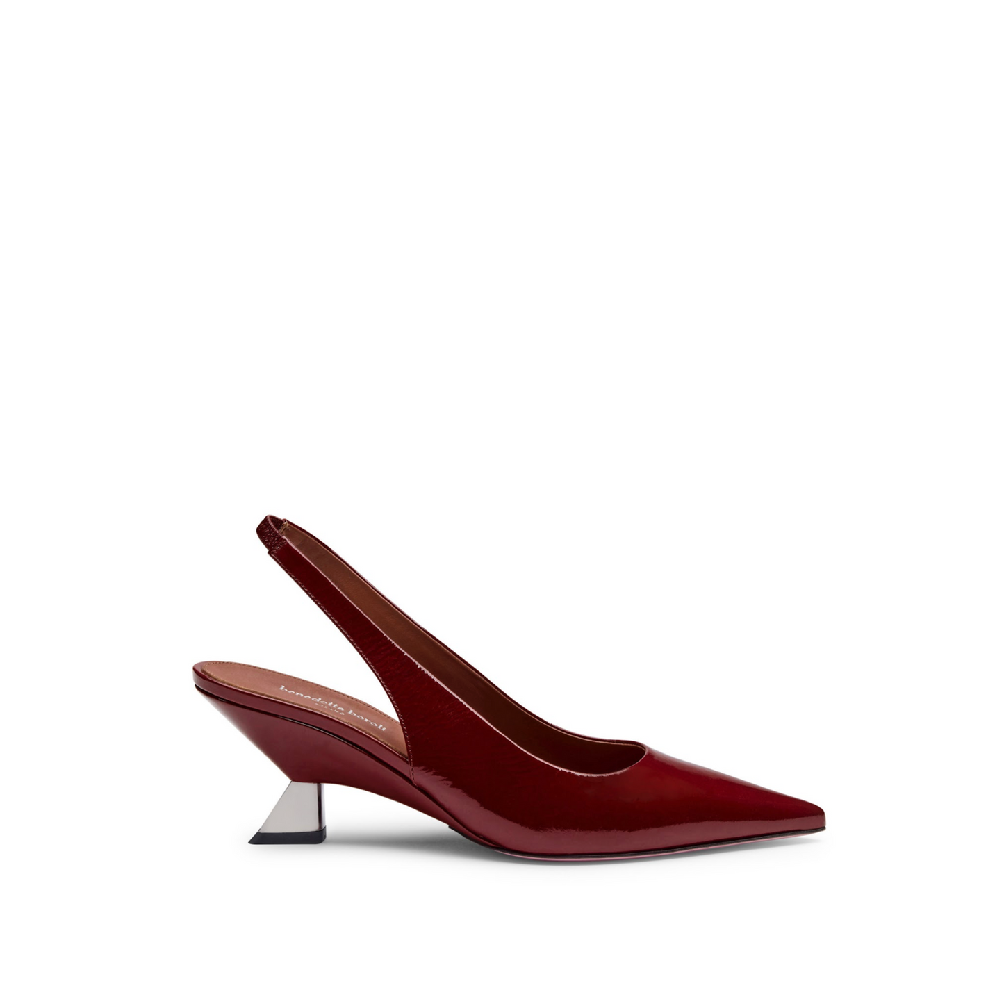 Slingback in vernice Ribes con punta affusolata, dal design essenziale che ne sottolinea la raffinatezza. L’elastico posteriore assicura una calzata stabile e confortevole, mentre l’iconico tacco zeppa da 65 mm garantisce il giusto supporto e un comfort prolungato. Un modello pensato per essere indossato dalla mattina alla sera, senza rinunciare all’eleganza.