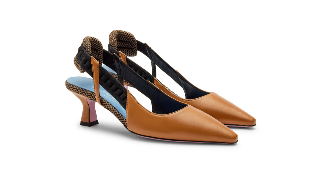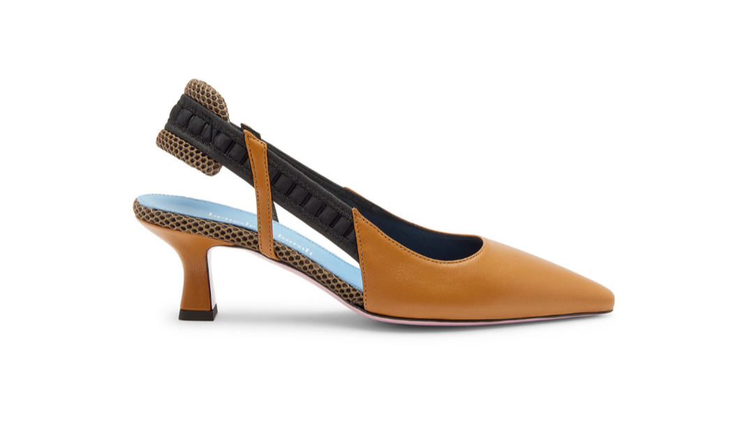 Slingback con punta affusolata in nappa hazelnut. Il tallone è rifinito con un inserto in neoprene che garantisce comfort prolungato e stabilità durante la camminata. Il tacco da 65 mm assicura un’altezza equilibrata, pensata per un’eleganza quotidiana e dinamica.