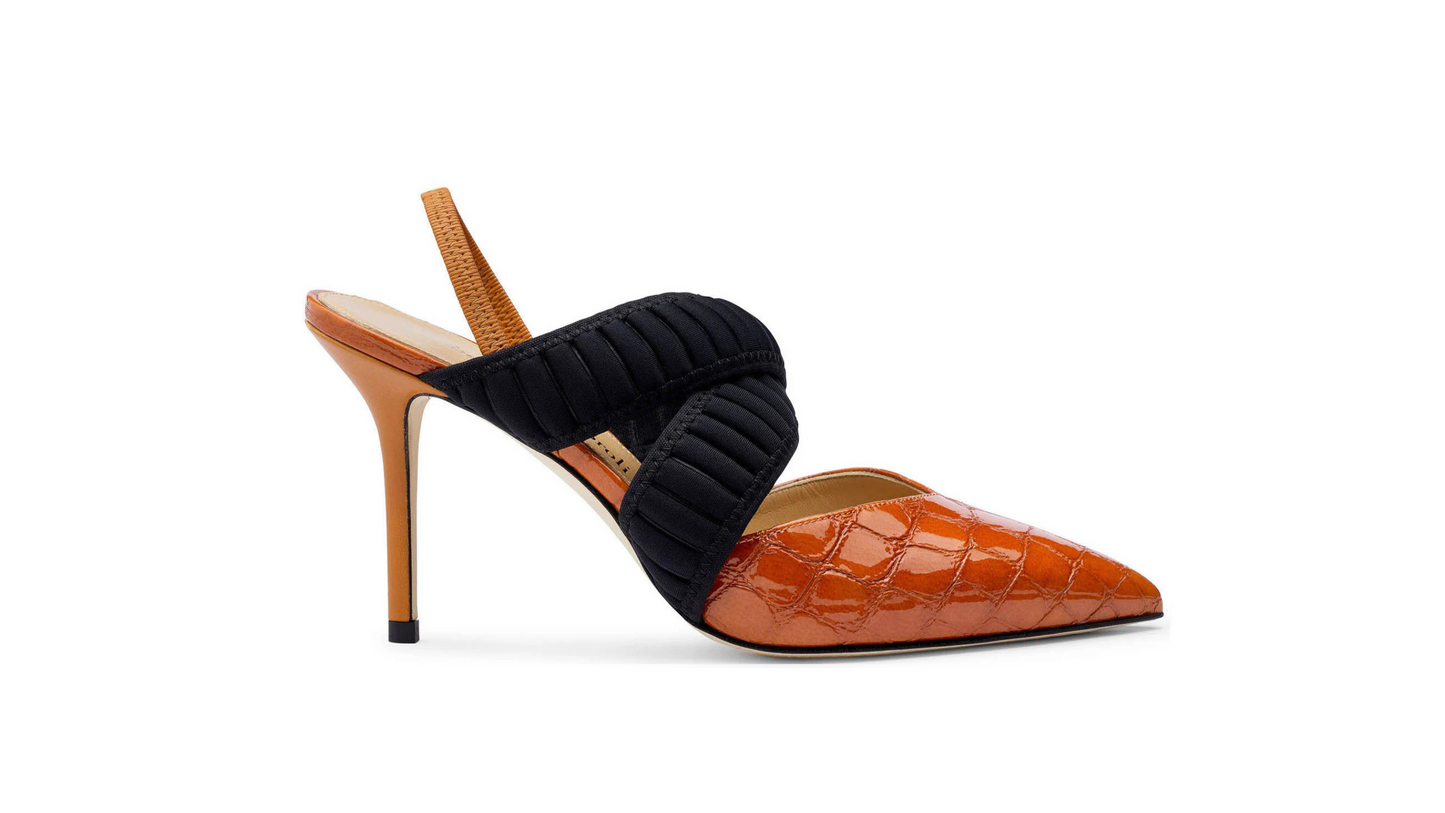 La slingback Tecla in stampa cocco tan è iper-femminile: il tacco midi a stiletto e le iconiche fasce in neoprene avvolgono il piede creando un comodo intreccio.