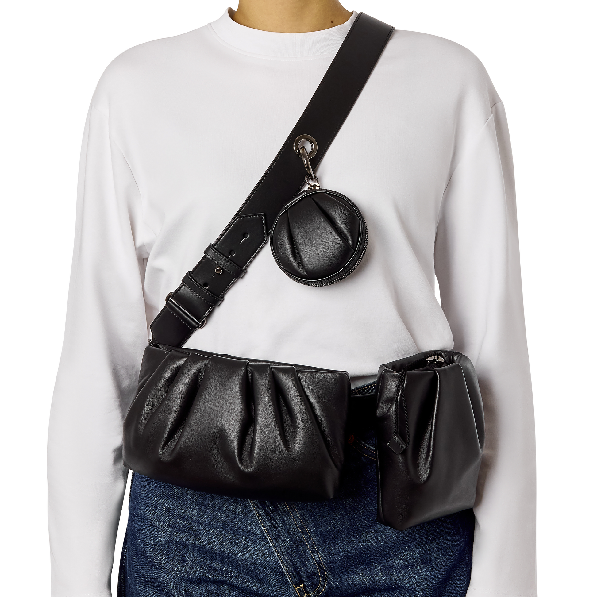 Realizzata in morbida nappa Nero con interni in rete tecnica, unisce funzionalità e design essenziale. Indossala come crossbody completa per un look dinamico, scegli la cintura con pochette per una passeggiata pratica o porta la pochette a mano per un’eleganza minimal.