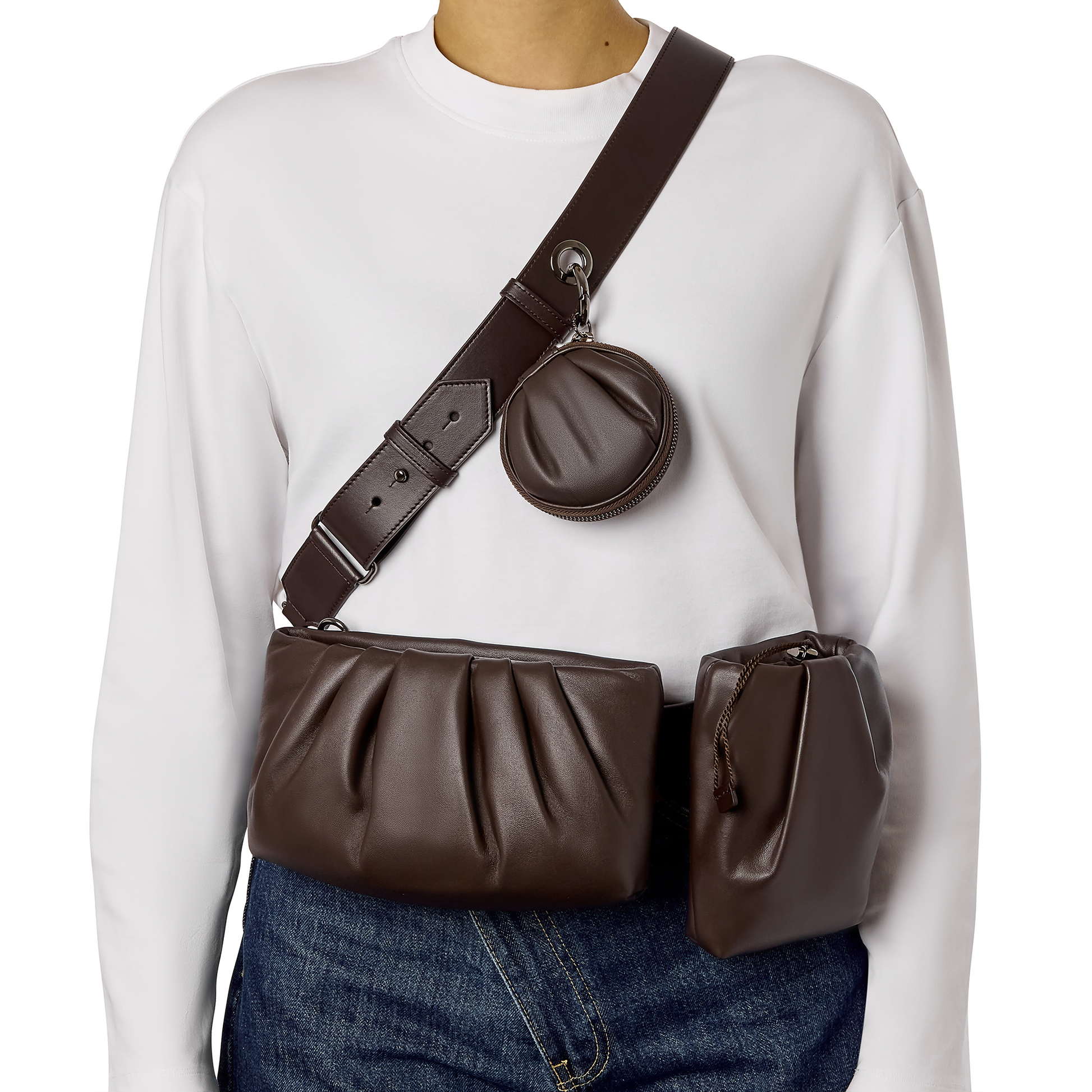 Realizzata in morbida nappa Moka con interni in rete tecnica, unisce funzionalità e design essenziale. Indossala come crossbody completa per un look dinamico, scegli la cintura con pochette per una passeggiata pratica, o porta la pochette a mano per un’eleganza minimal.