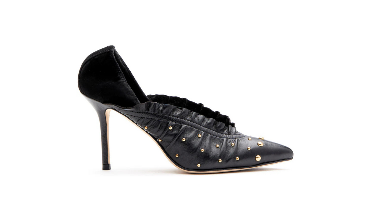 La décolleté di lusso Valeria sfila verso il futuro. Audace e aggraziata è accompagnata da dettagli di rouge, borchie dorate e tallone morbido. Il design moderno è valorizzato dal tacco midi. Completamente Made in Italy, è la scarpa perfetta da indossare con un pantalone a zampa o con un tubino.